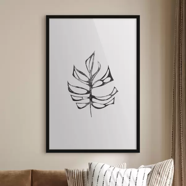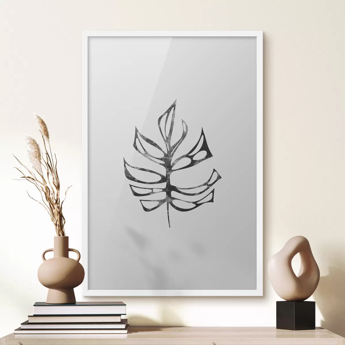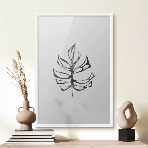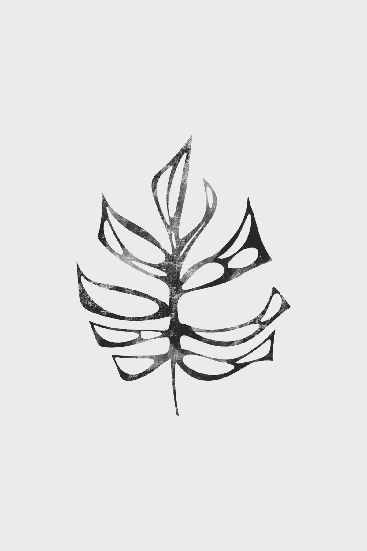 Plakat Lõigete ja aukudega dekoratiivne leht, troopiline, tekstureeritud must värv, minimalism, lilleline f38342
