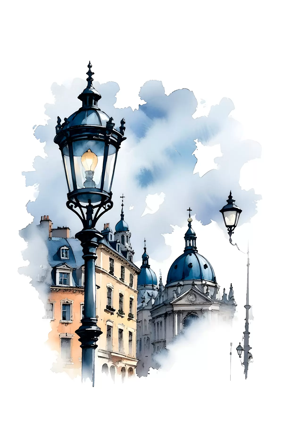 Plakat Kuplikujulise hoonega ehitud tänavalatern pilves päeval f38364