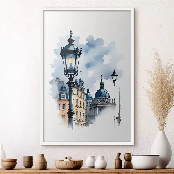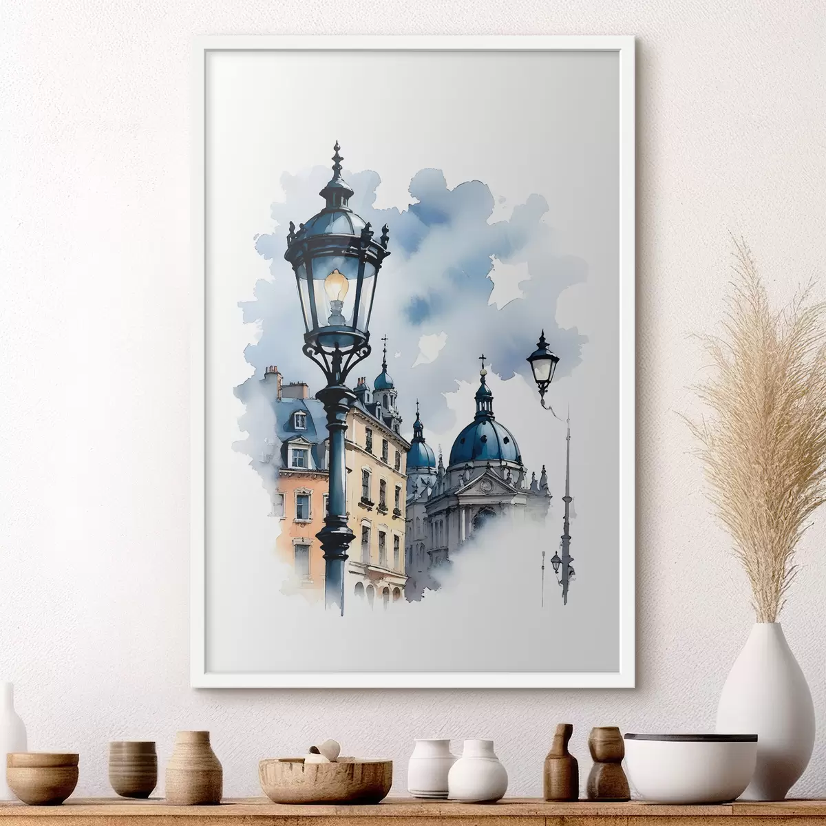 Poster Kuplikujulise hoonega ehitud tänavalatern pilves päeval Nr f38364