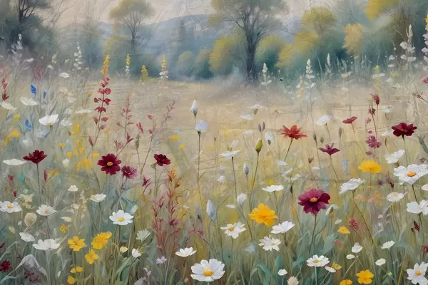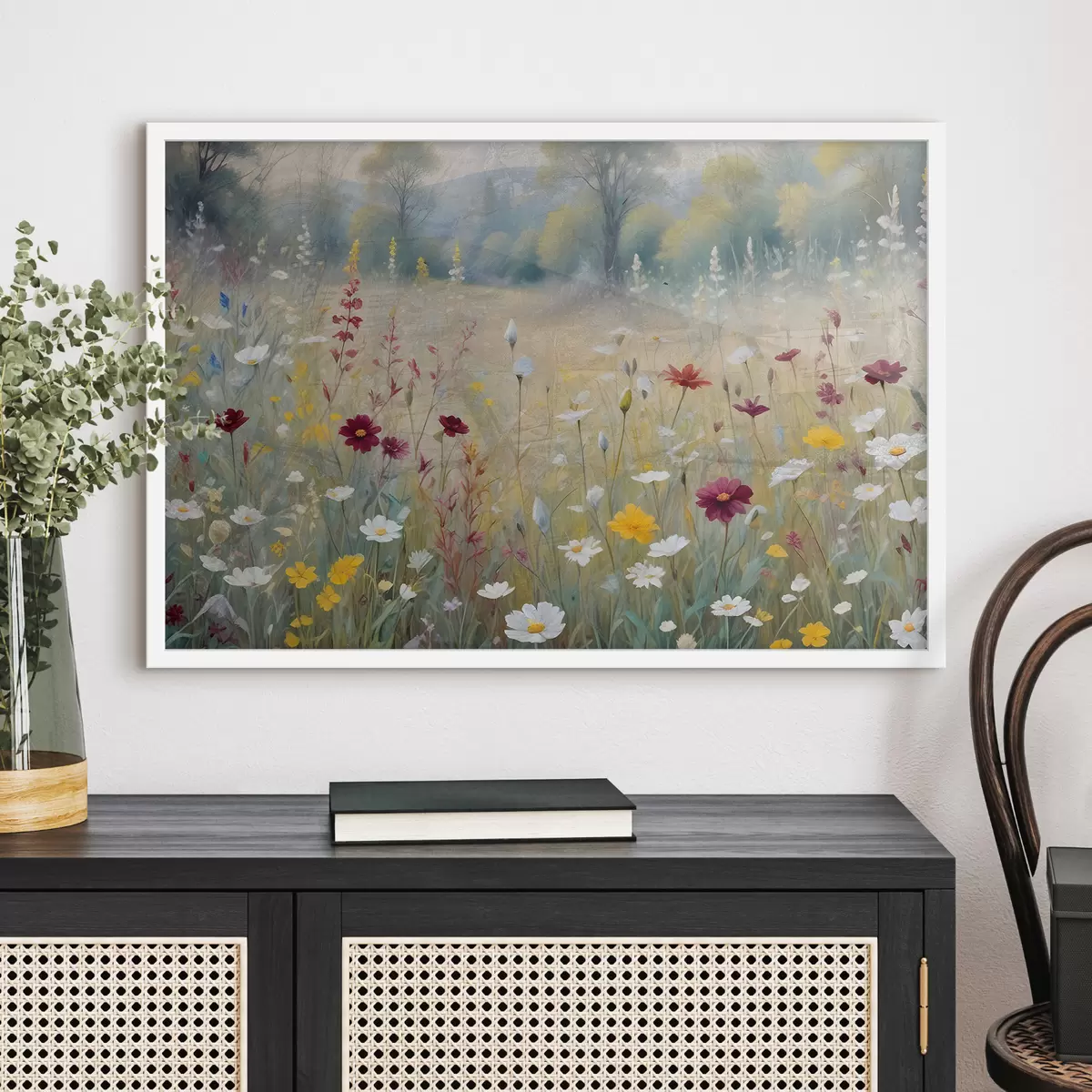 Plakat Värviline metsalilledega heinamaa, mille taustal on ähmane mets f38368