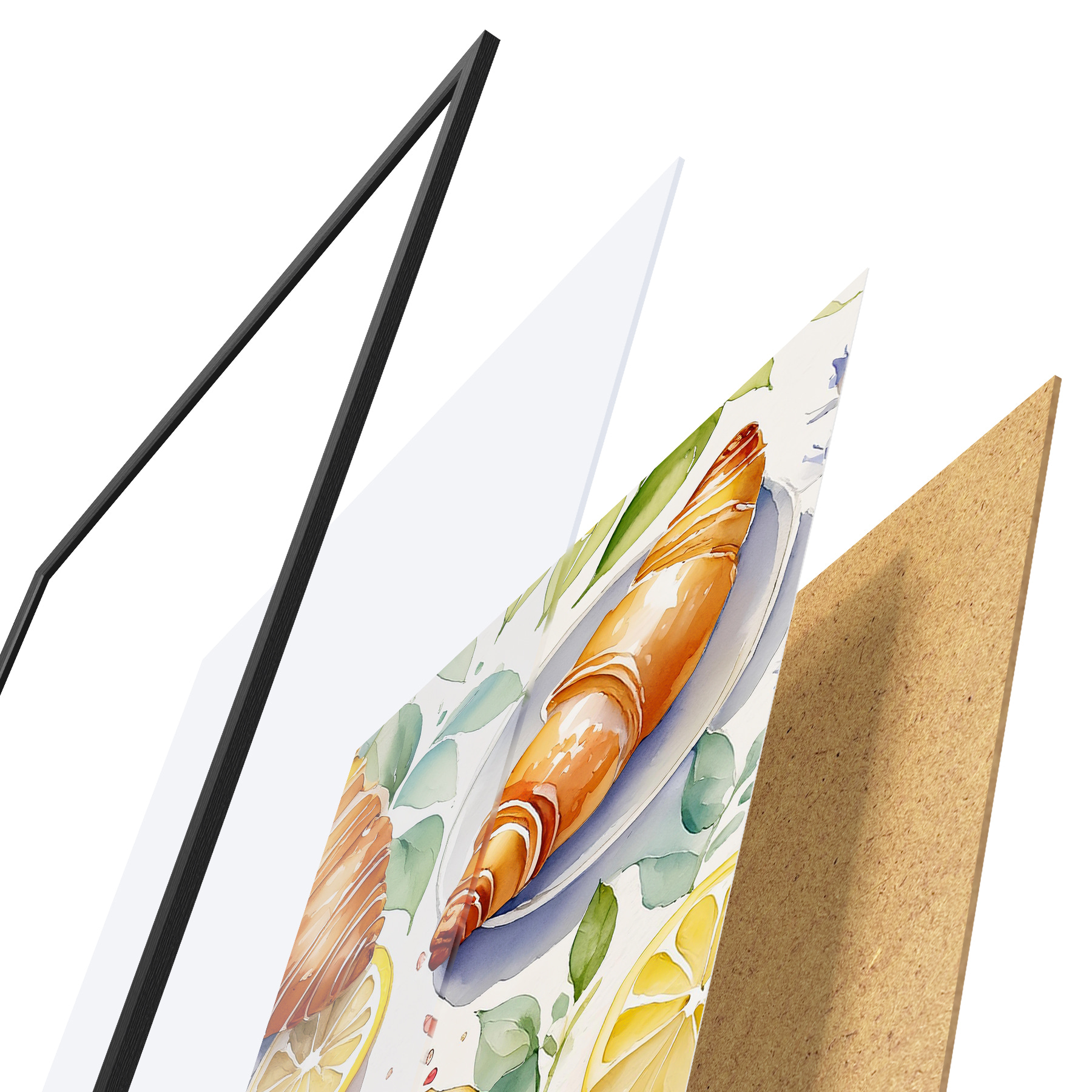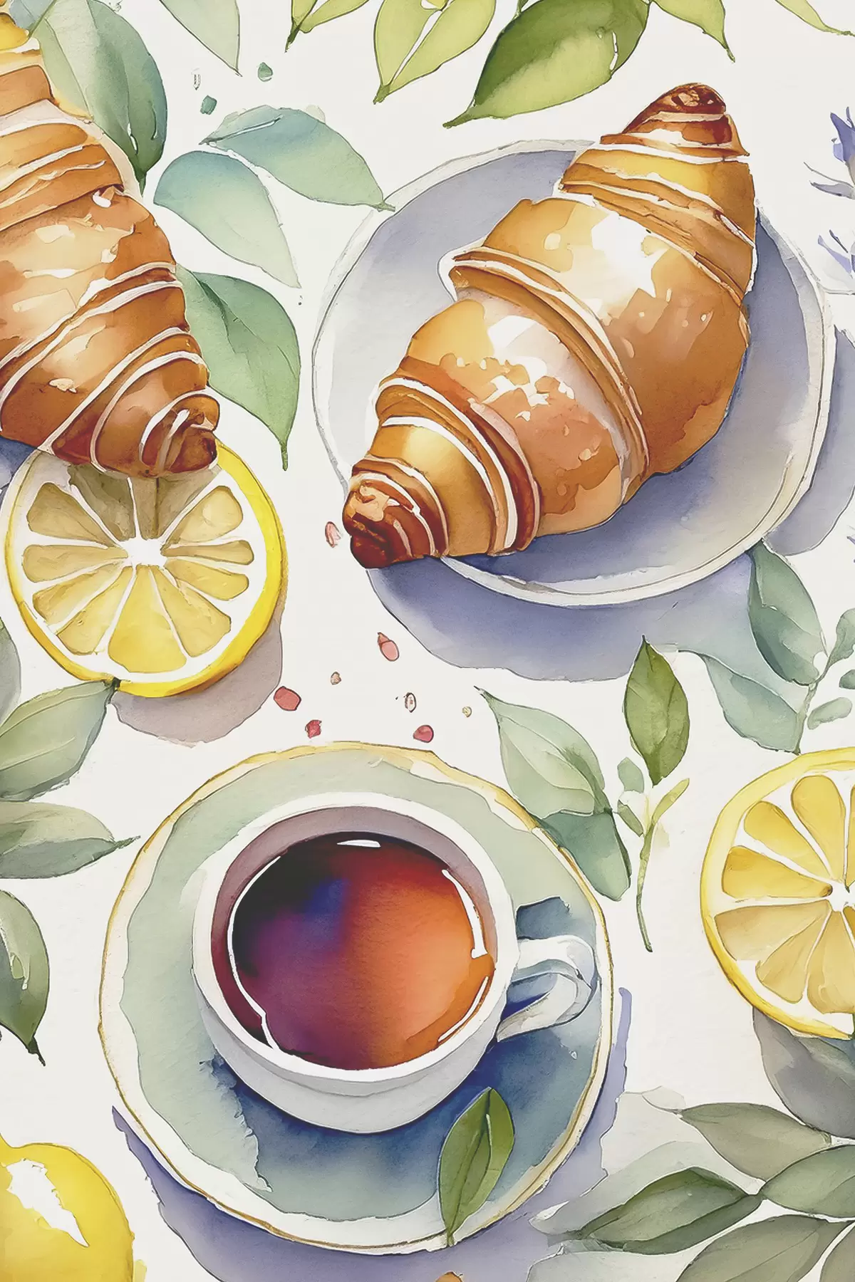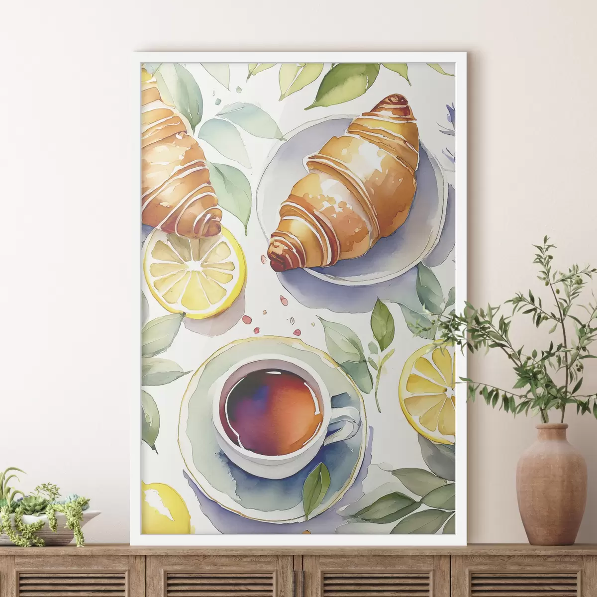 Plakat Croissant akvarell, tass teed, hommikusöök, sidrunid, maalähedane stiil f38389