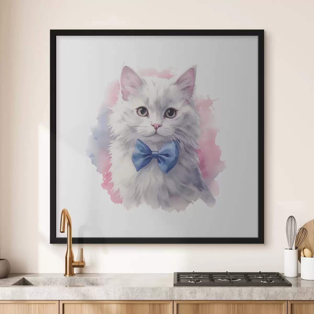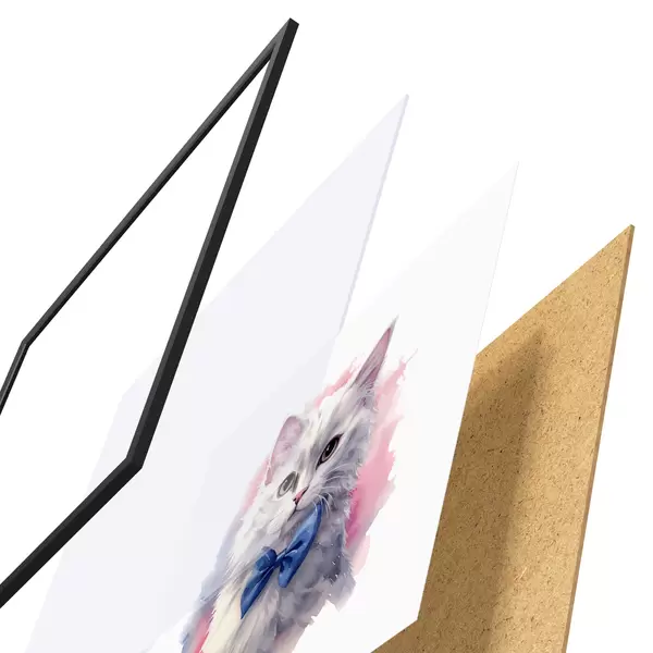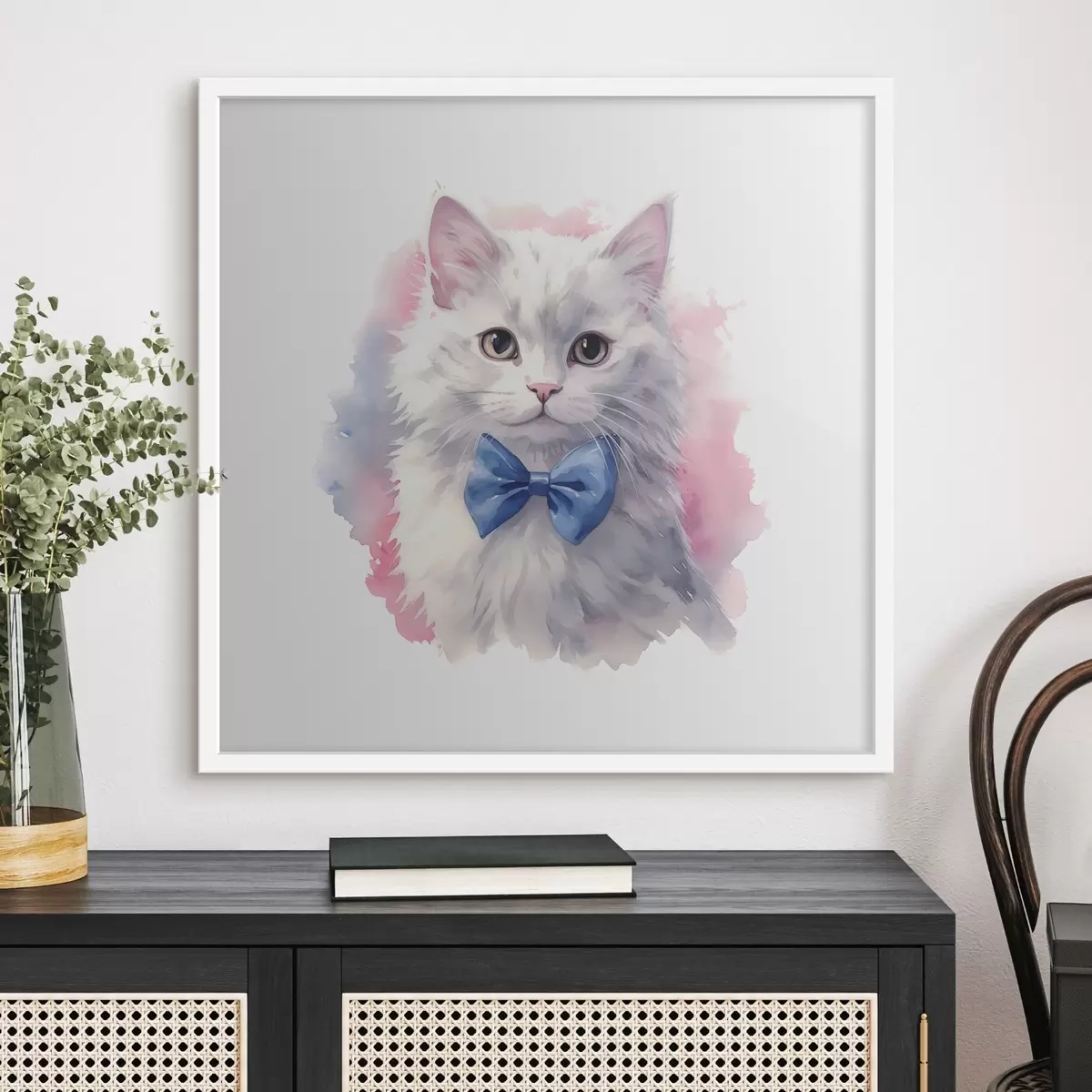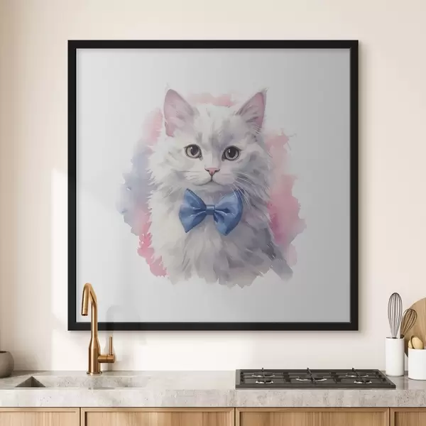Poster Valge kohev kass sinise vibuga kaelas, akvarell, loom, hall, valge, roosa, sinine värvus Nr f38479