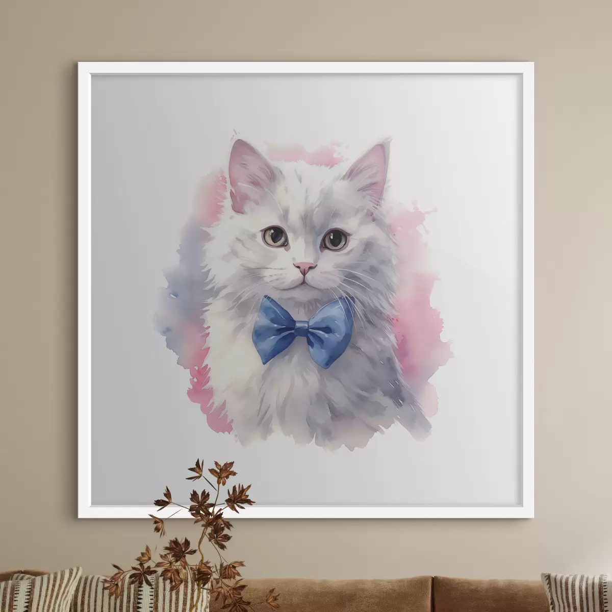 Plakat Valge kohev kass sinise vibuga kaelas, akvarell, loom, hall, valge, roosa, sinine värvus f38479