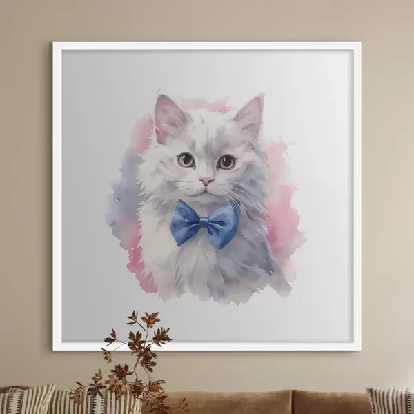 Poster Valge kohev kass sinise vibuga kaelas, akvarell, loom, hall, valge, roosa, sinine värvus Nr f38479