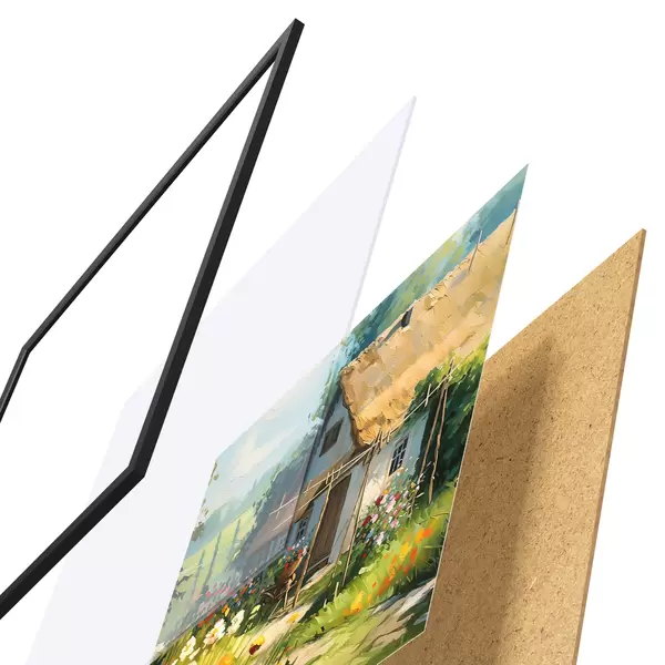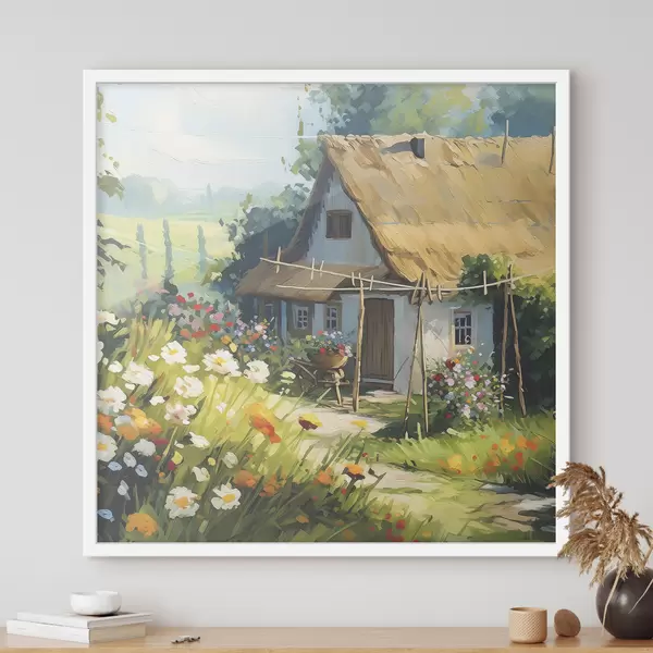 Poster Aiaga külamaja, suvelilled, oliilvärv, pintslitõmme, põld, rustikaalne stiil Nr f38491