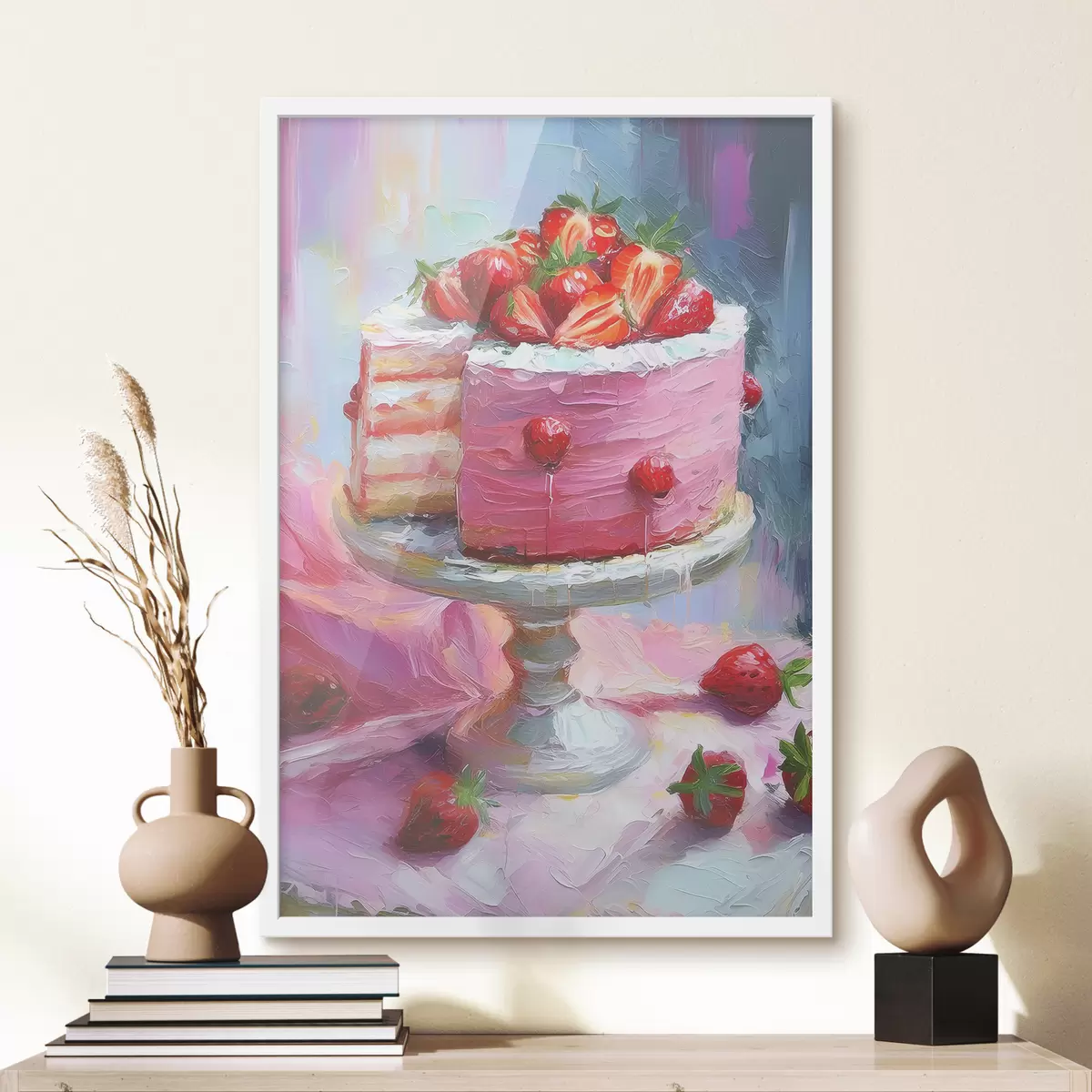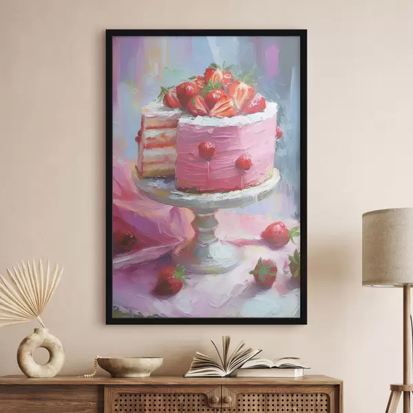 Poster Maasikatort kreemiga, õlivärv, suured pintslitõmbed, suvised marjad, roosad värvid Nr f38499