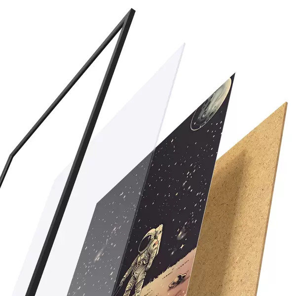 Plakat koosneb raamist, pleksiklaasist, trükitud pildist ja puitlaastplaadist alusplaadist. Tänu tagaküljel olevatele kinnitustele saab plakati kohe seinale riputada.