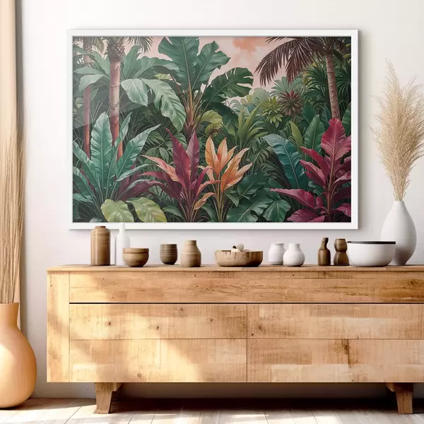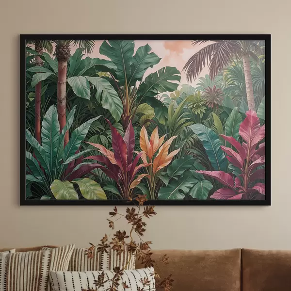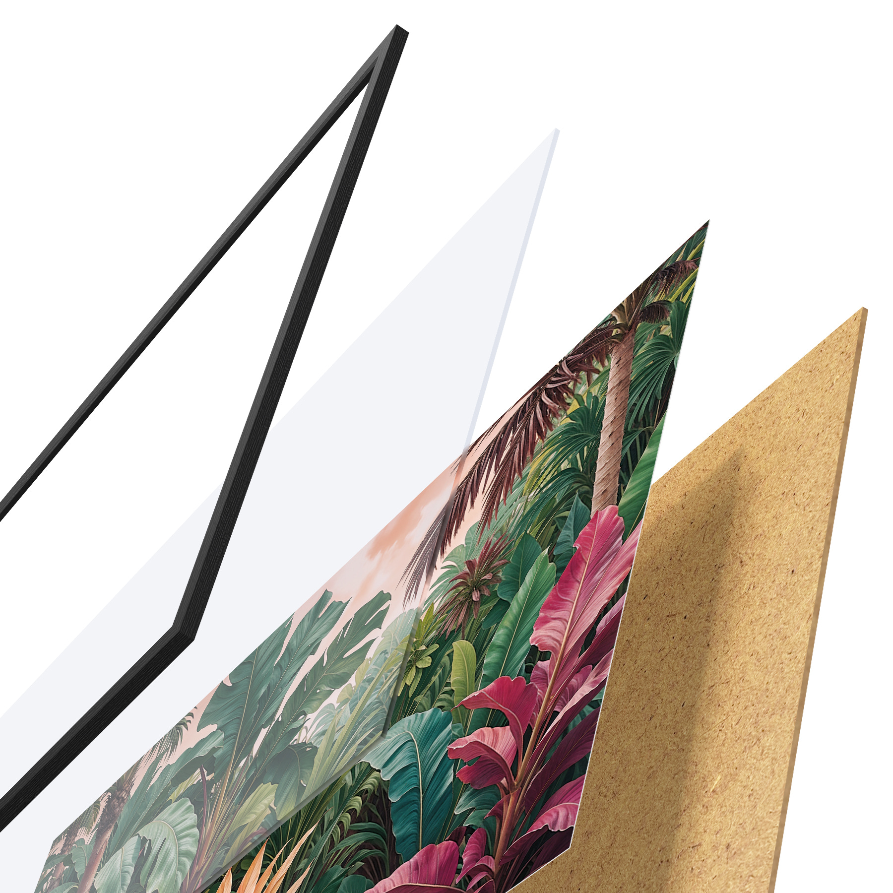 Plakat Lopsakas troopiline džungel elavate roheliste lehtede, palmilehtede ja värviliste lilledega f38817