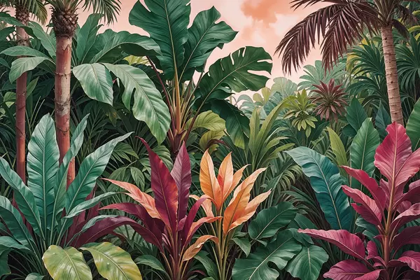Plakat Lopsakas troopiline džungel elavate roheliste lehtede, palmilehtede ja värviliste lilledega f38817
