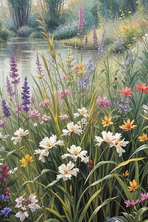 Poster Metslilled ja kõrged kõrrelised. Üldine stseen kujutab elavat looduslikku maastikku Nr f38829