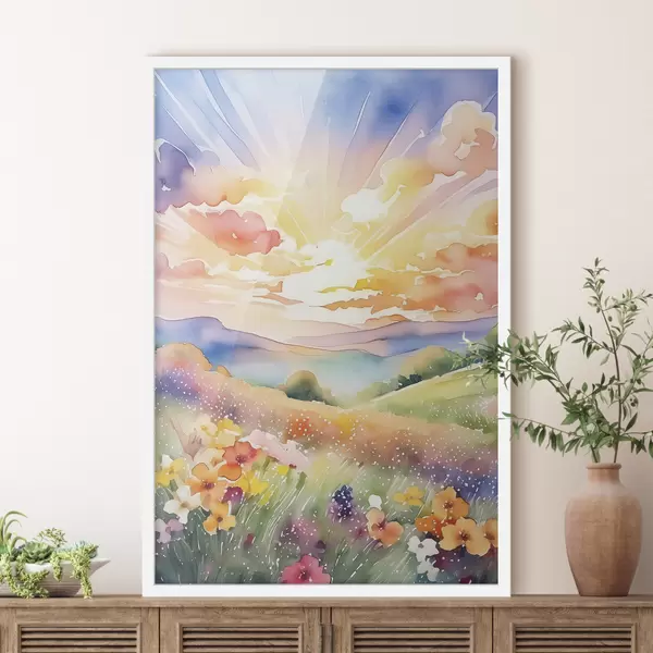 Plakat Päikeseloojang suveväljal, lilled, päike, värviline taevas, pilved, loodus f38842