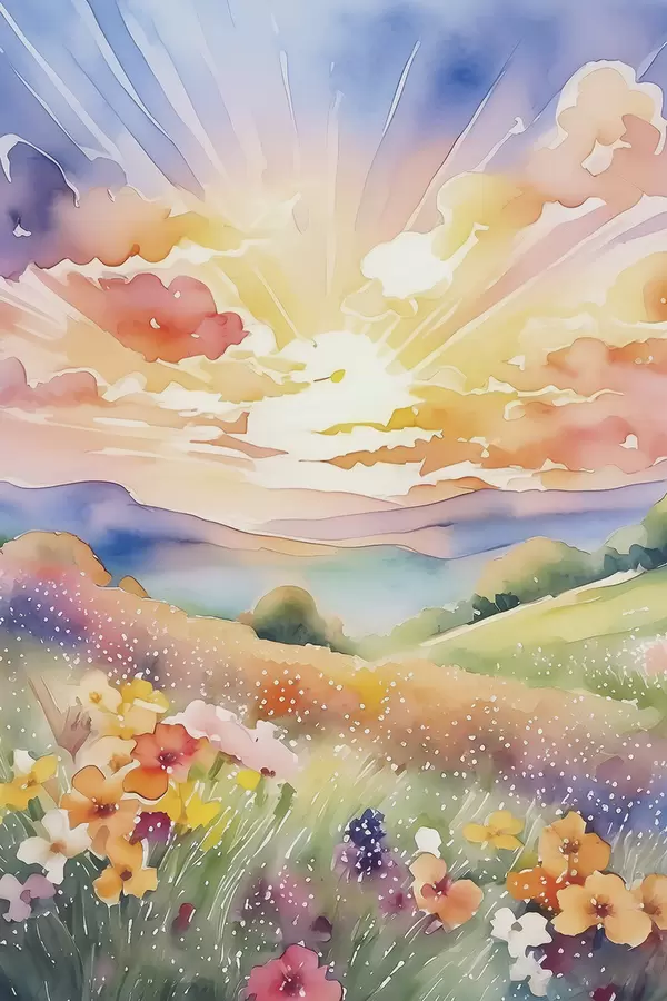 Plakat Päikeseloojang suveväljal, lilled, päike, värviline taevas, pilved, loodus f38842