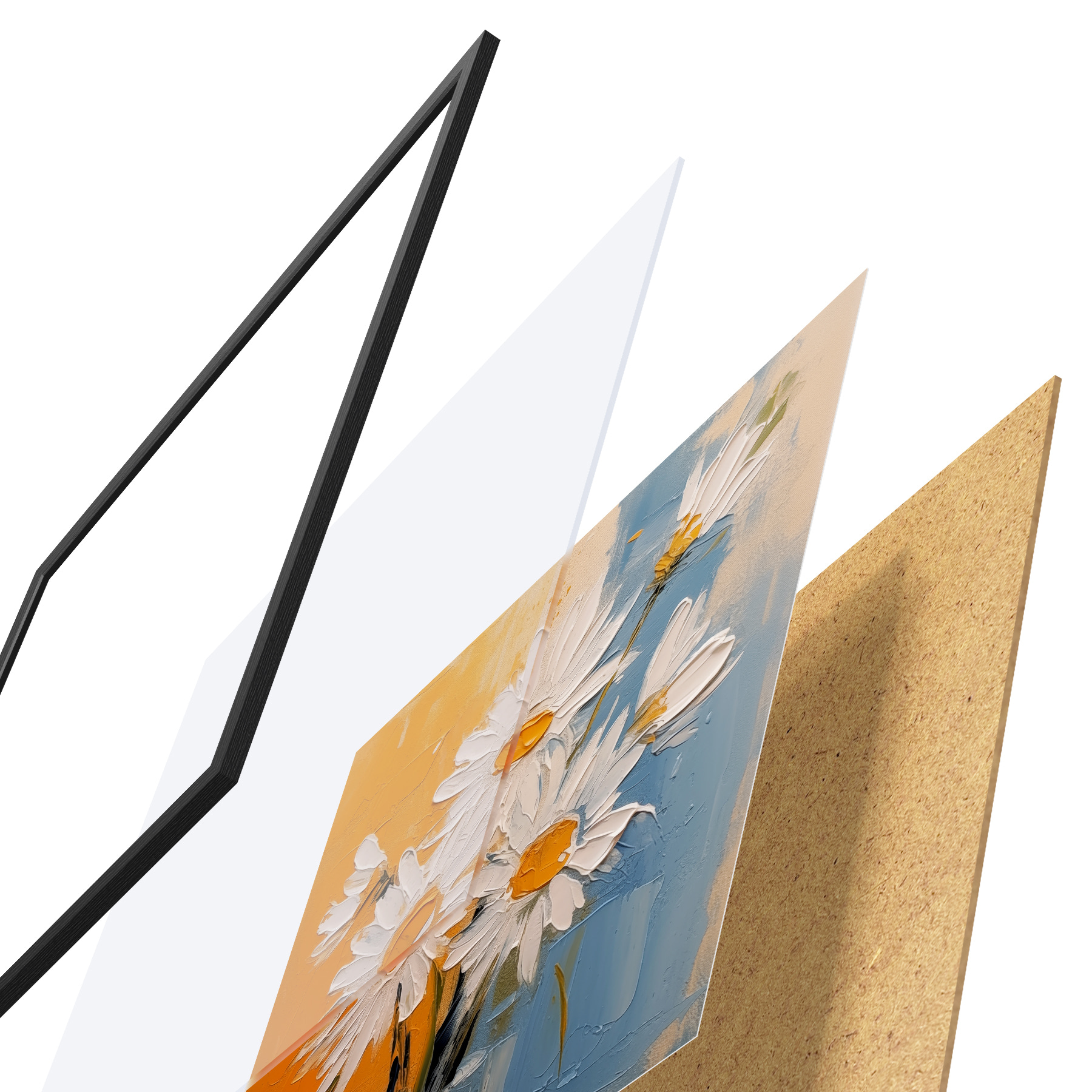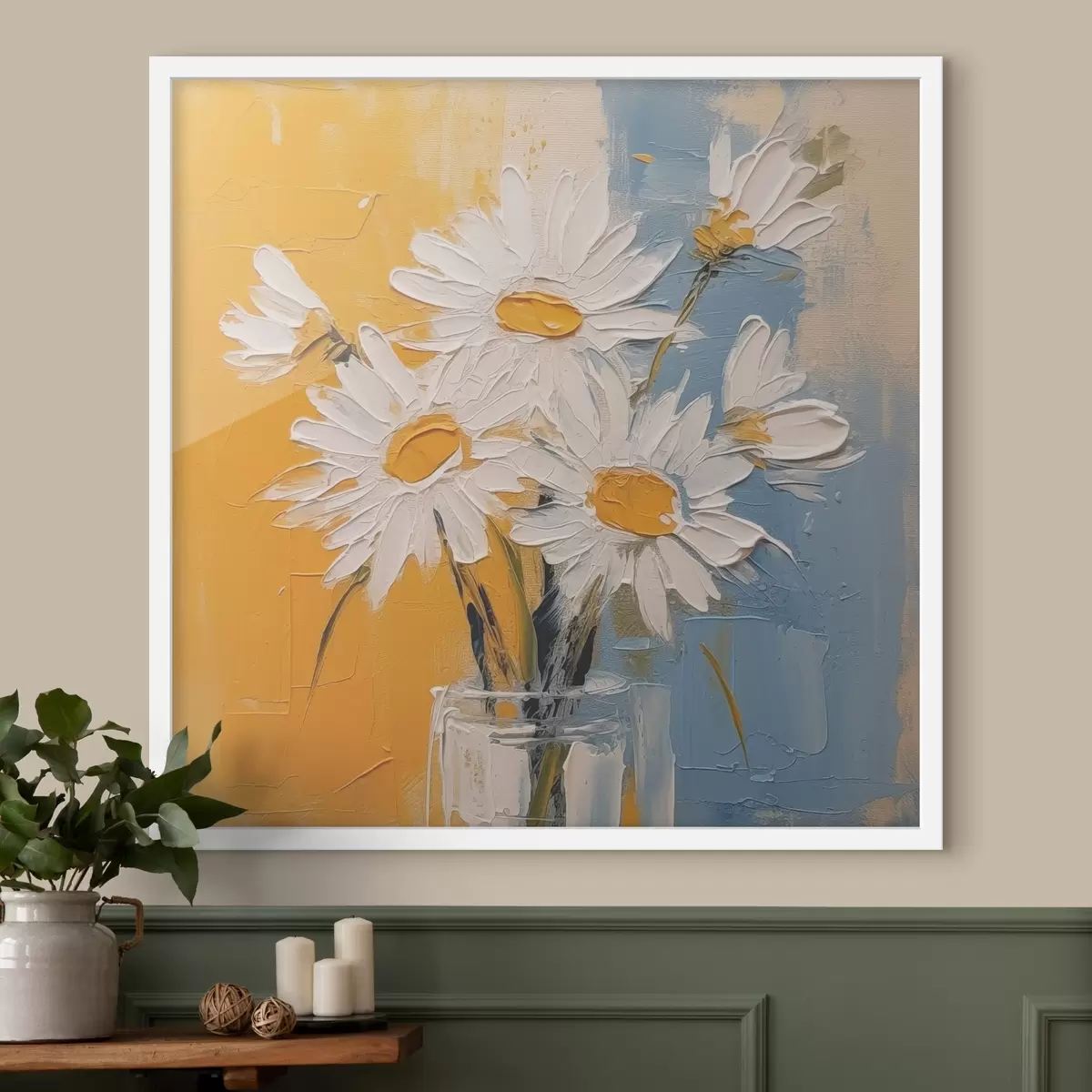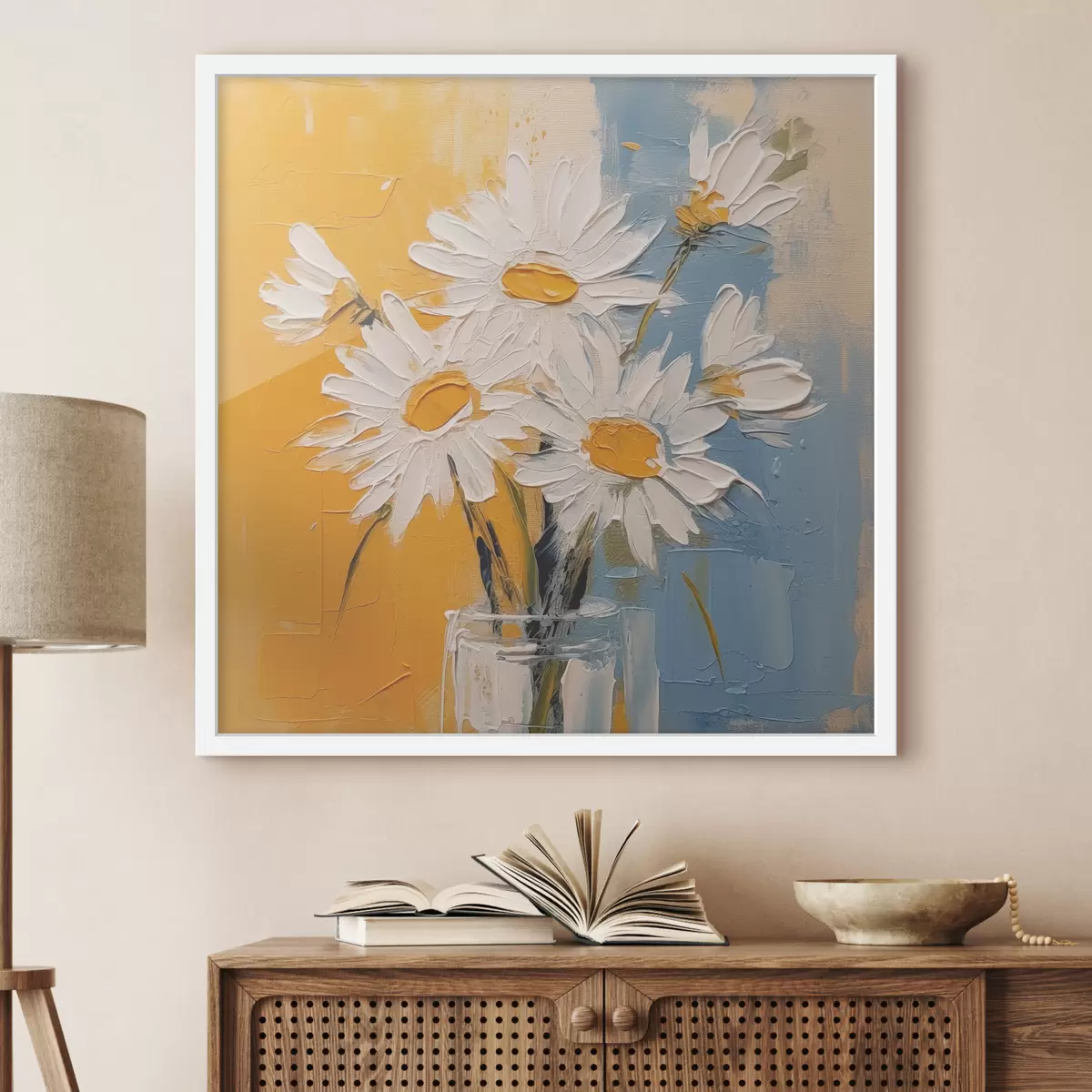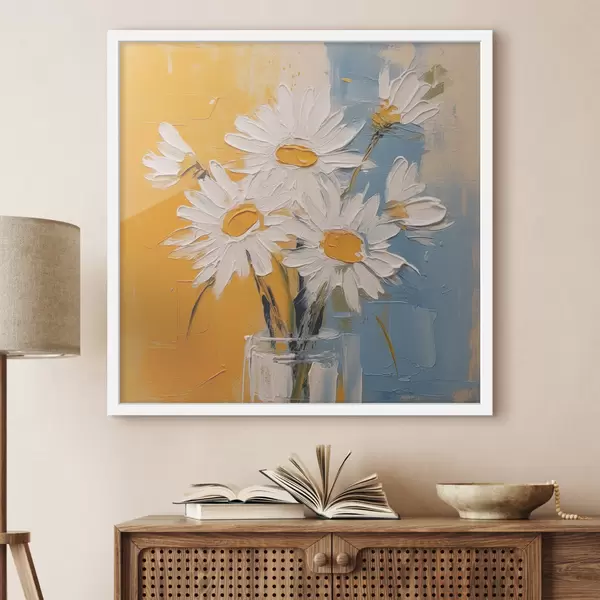 Poster Valged karikakrad klaasvaasis sinisel ja kollasel taustal, õlimaali imitatsioon, suured jooned Nr f38907