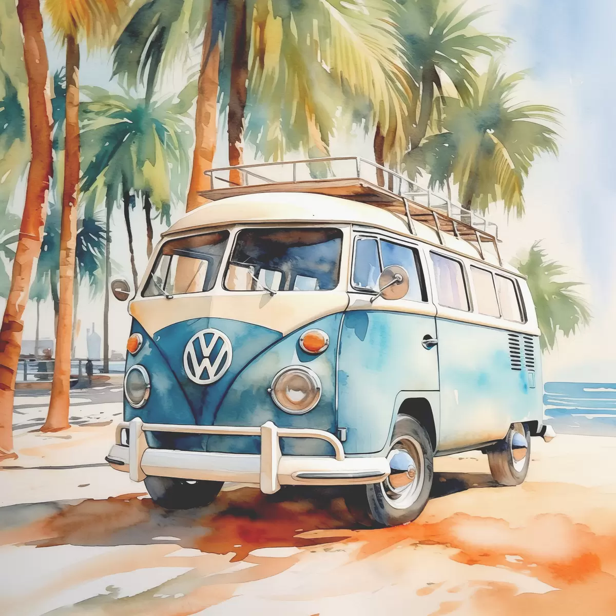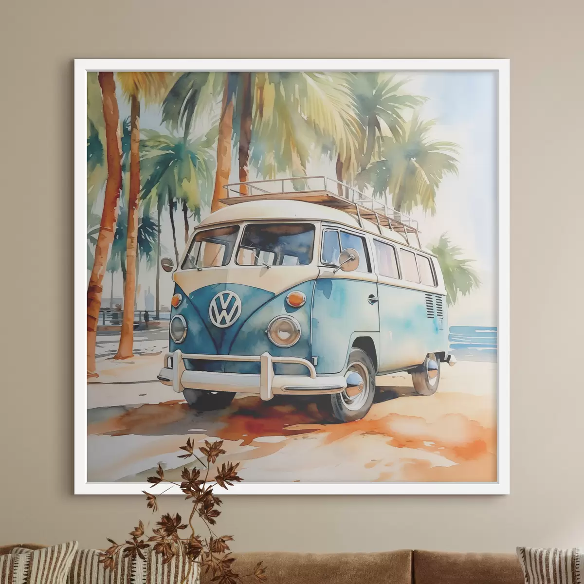 Plakat Reisiauto on pargitud rannas akvarellpalmide taustal f38911