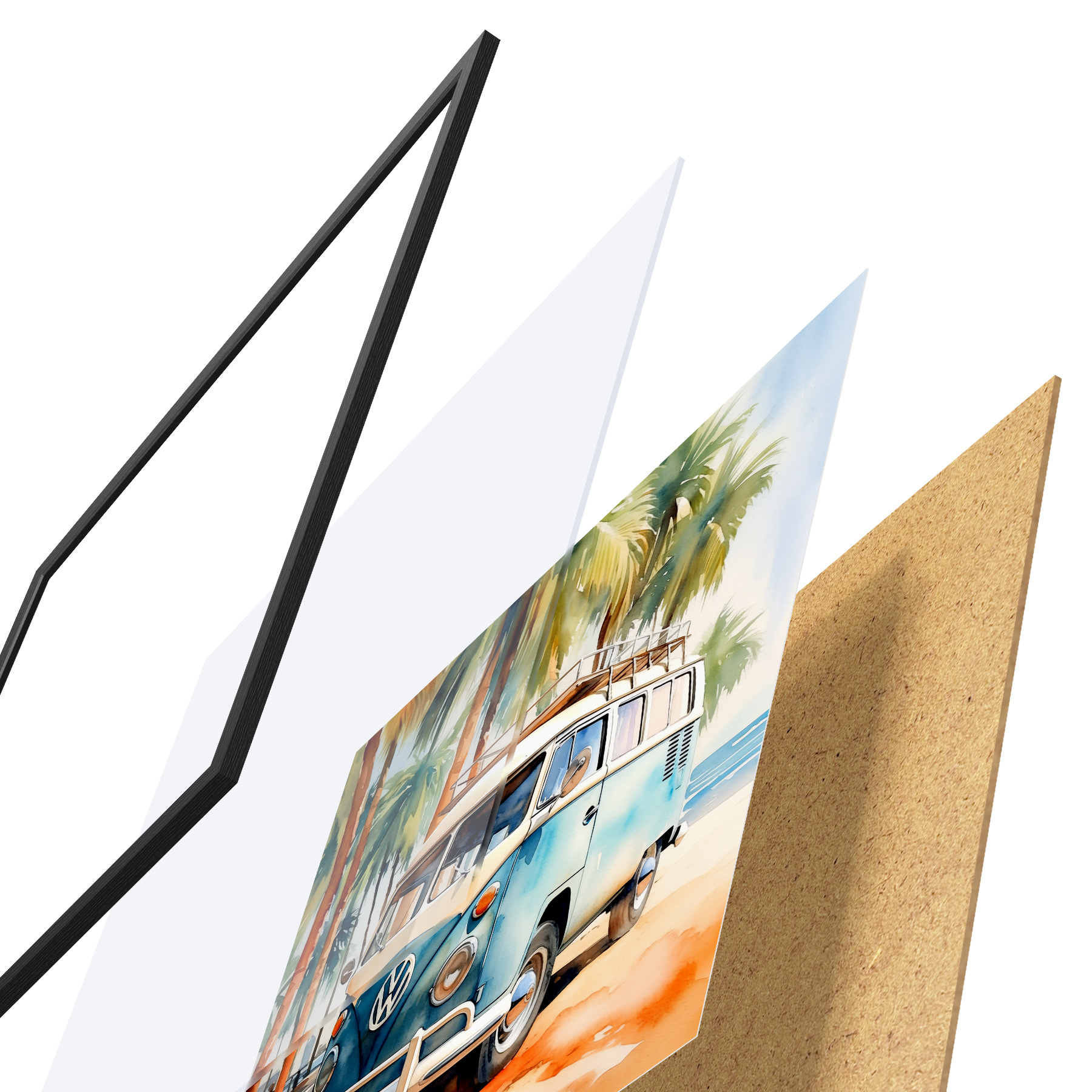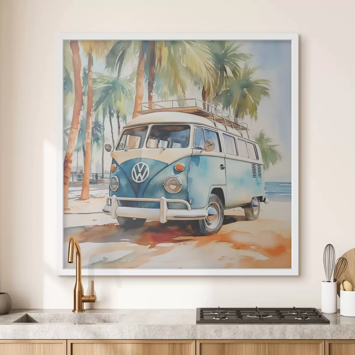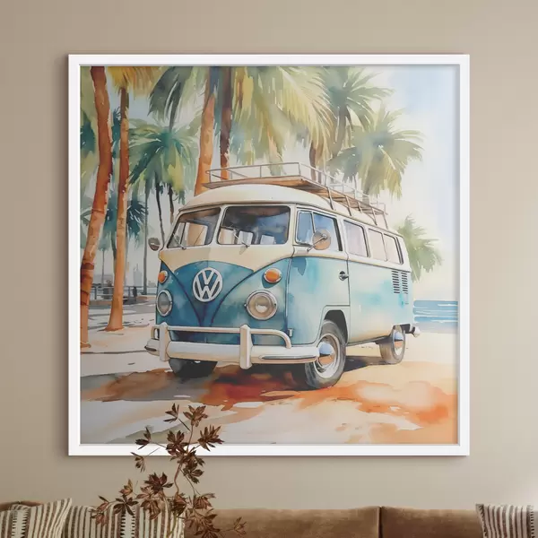 Poster Reisiauto on pargitud rannas akvarellpalmide taustal Nr f38911