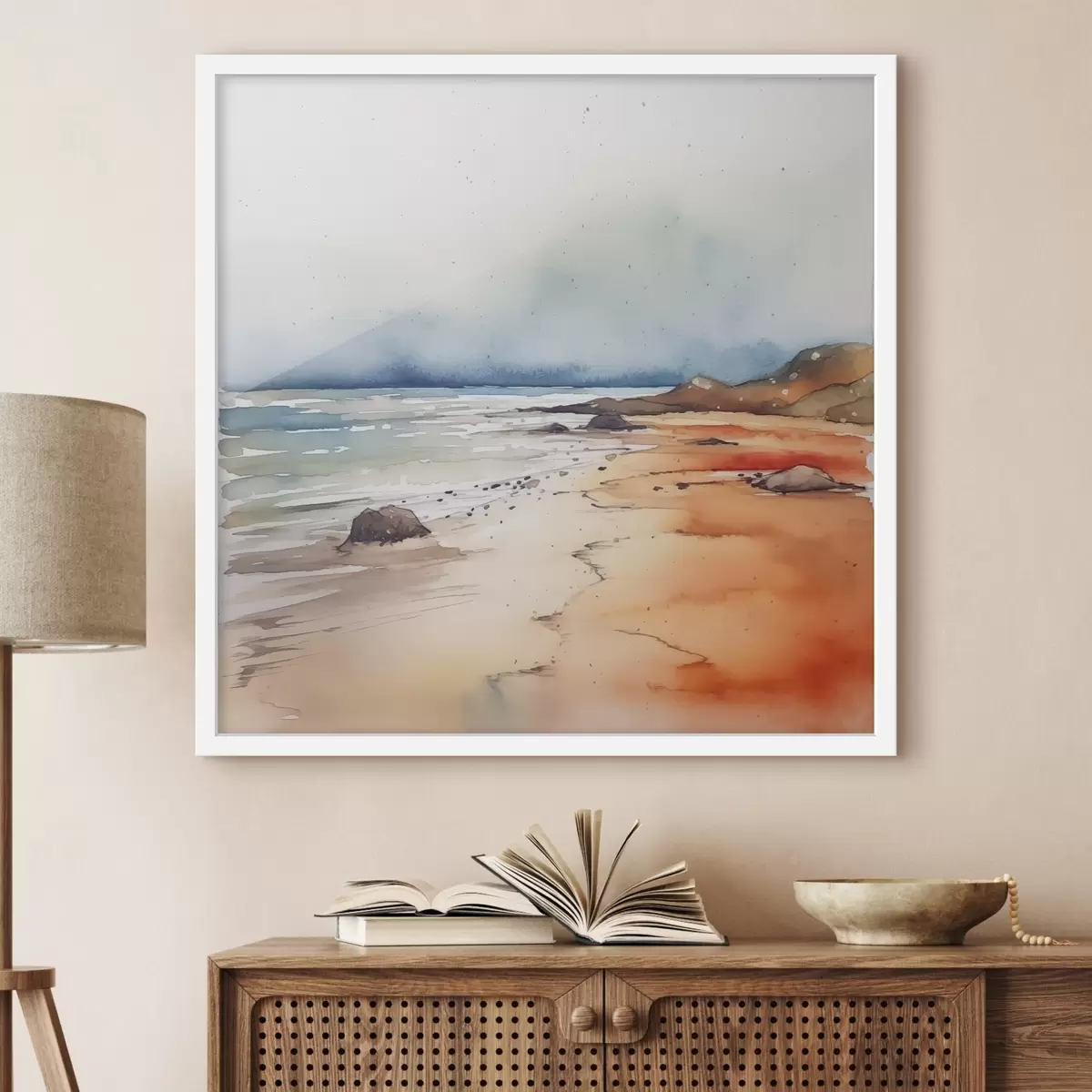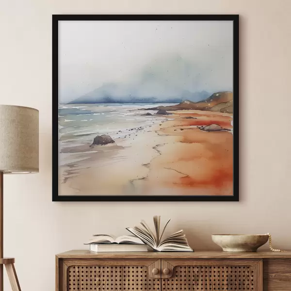 Poster Meri ja rand, vihm, akvarell, plekid, maastik, maastik, sinine, oranž värvus Nr f38936