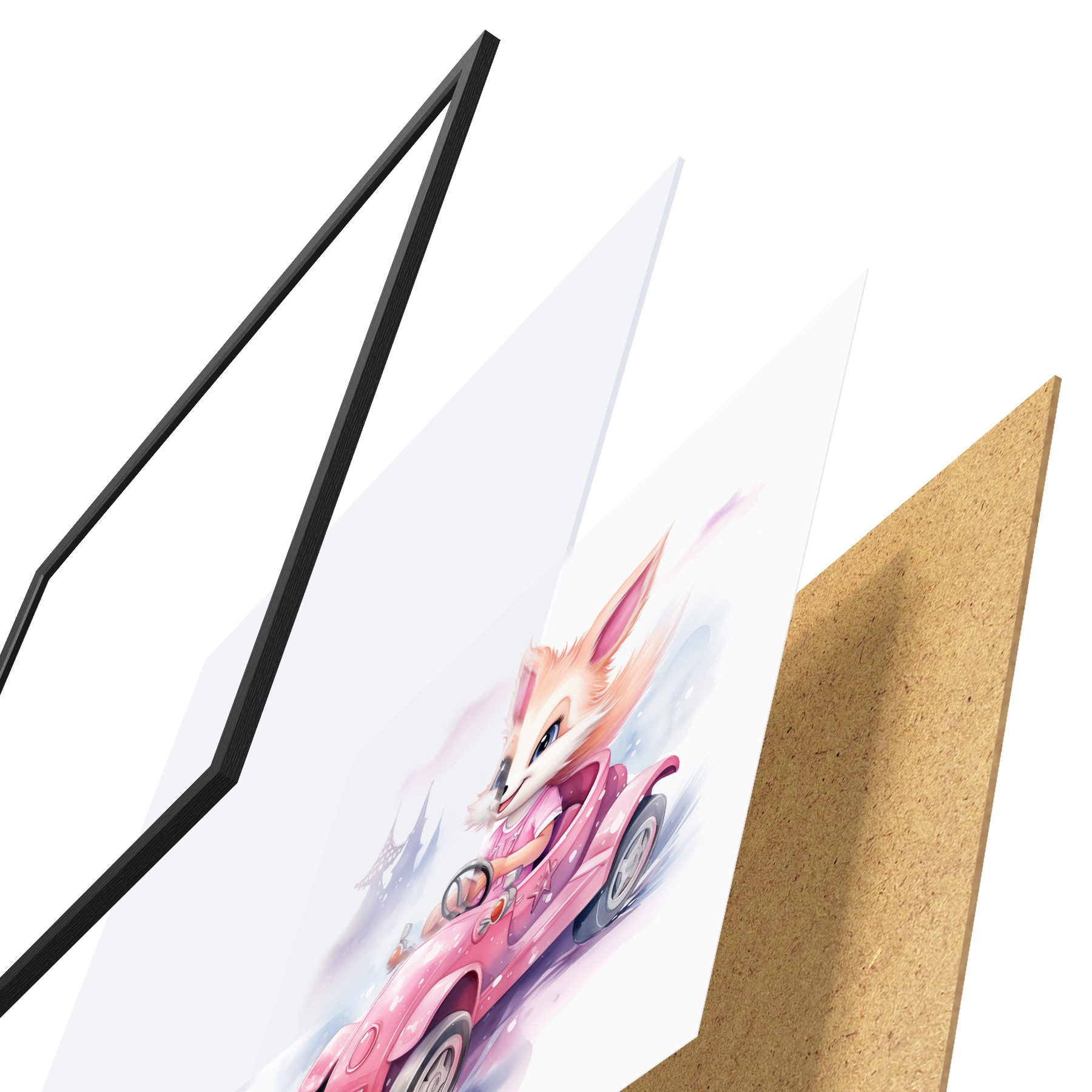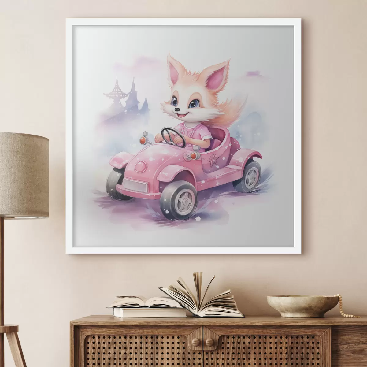 Plakat Väike rebane sõidab roosa autoga. Akvarellillustratsioon lastele f38943
