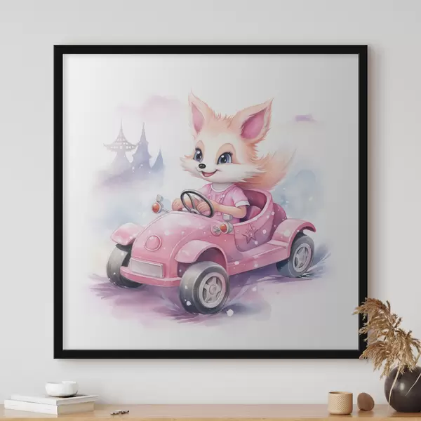 Poster Väike rebane sõidab roosa autoga. Akvarellillustratsioon lastele Nr f38943