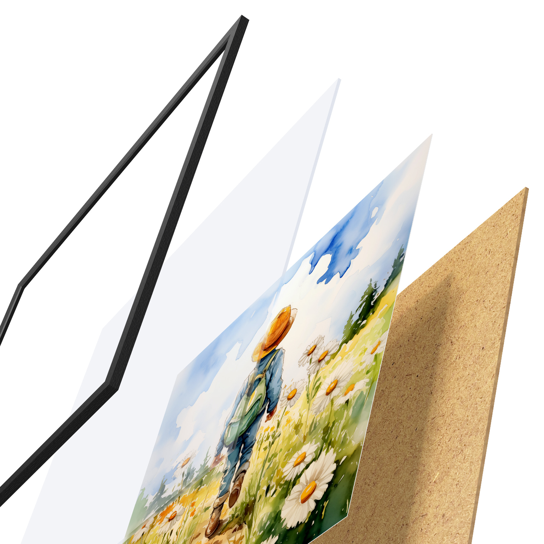 Plakat Kauboimütsis poiss, selja taga roheline seljakott ja sinine ülikond, kõnnib mööda teed kummeliväljal, akvarell f38946
