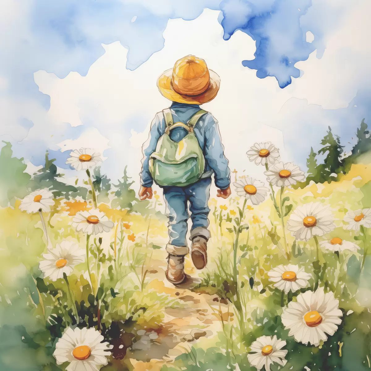 Poster Kauboimütsis poiss, selja taga roheline seljakott ja sinine ülikond, kõnnib mööda teed kummeliväljal, akvarell Nr f38946