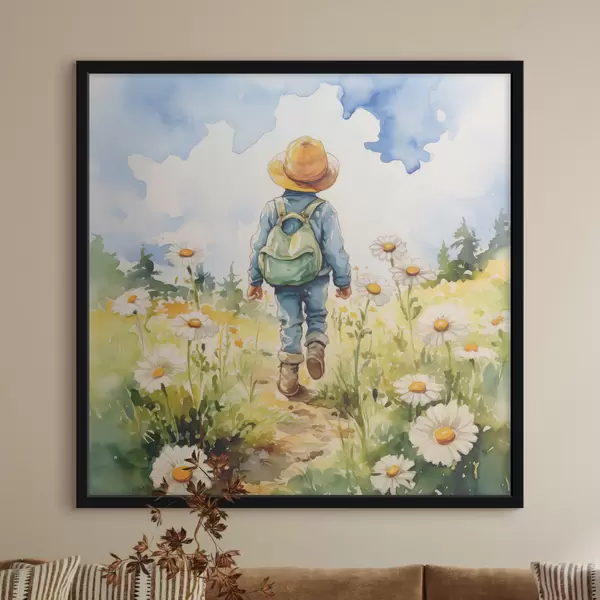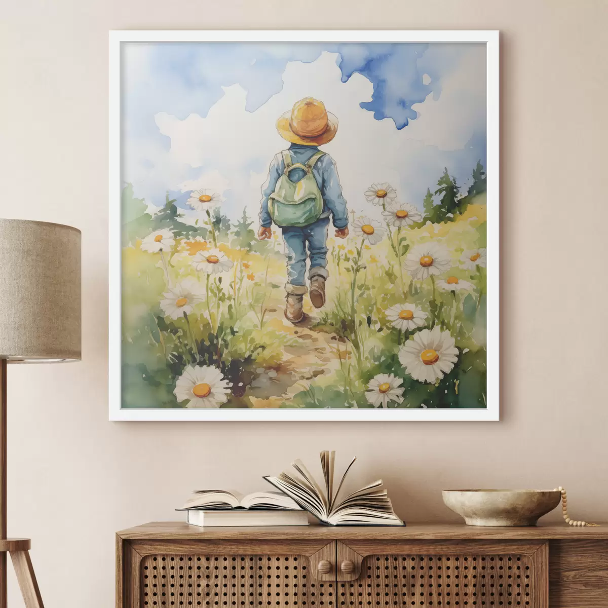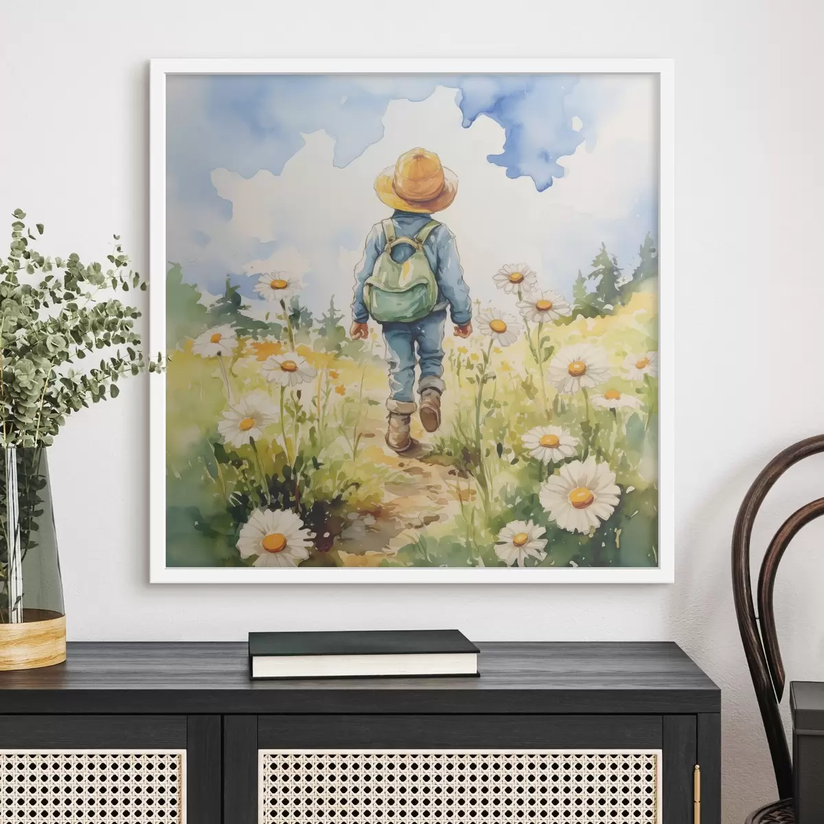 Plakat Kauboimütsis poiss, selja taga roheline seljakott ja sinine ülikond, kõnnib mööda teed kummeliväljal, akvarell f38946