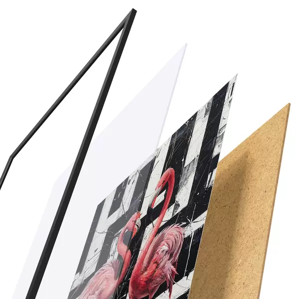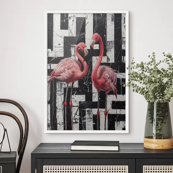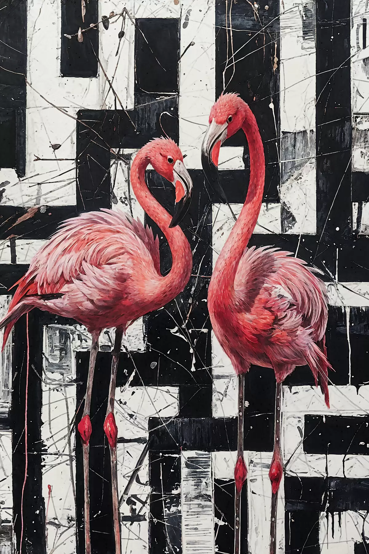 Poster Kaks roosat flamingot seisavad mustvalge abstraktse taustakunsti maali ees Nr f38954