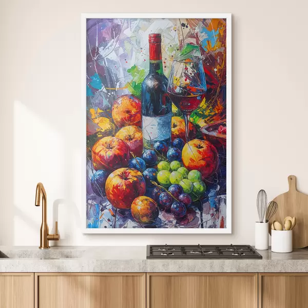 Poster Abstraktne natüürmort veinipudelist, veiniklaasist ja värvilistest puuviljadest erinevat värvi pritsmetega Nr f38958