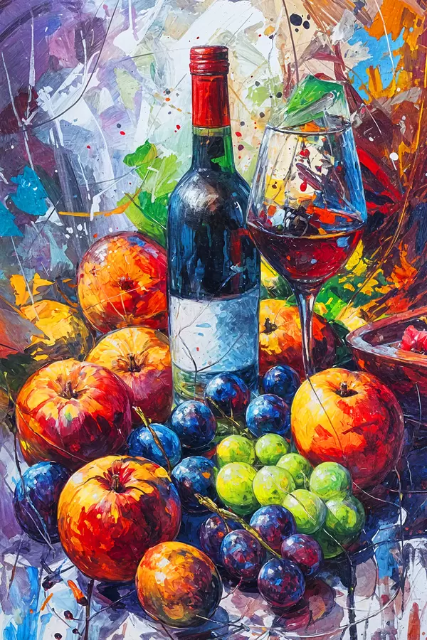 Poster Abstraktne natüürmort veinipudelist, veiniklaasist ja värvilistest puuviljadest erinevat värvi pritsmetega Nr f38958