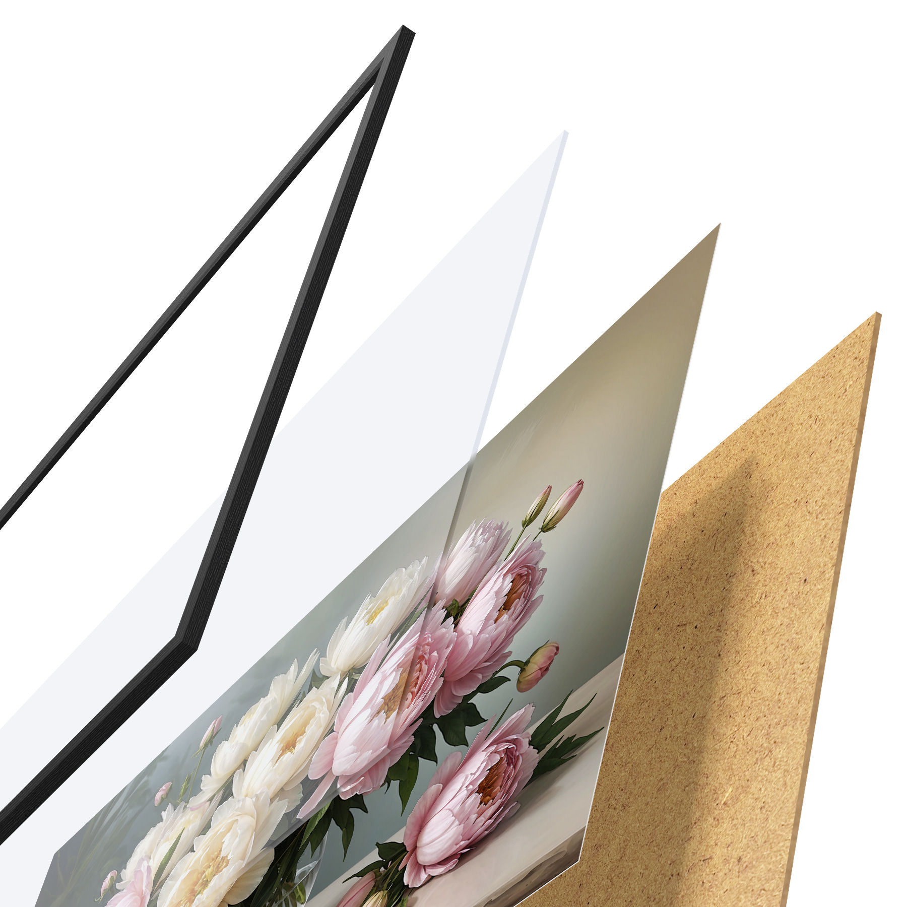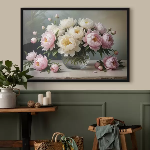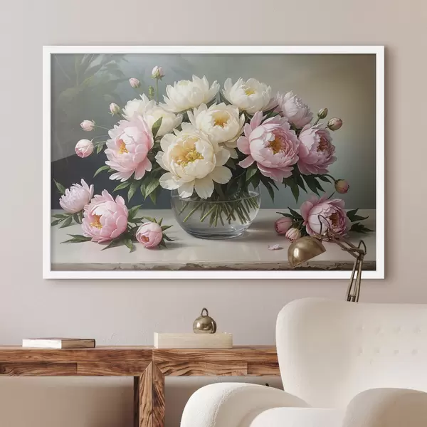 Plakat Kaunite valgete ja roosade pojengide kimbu maalimine klaasvaasis puidust lauale f38967