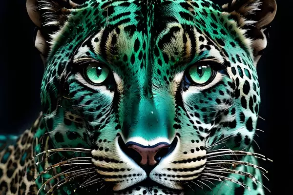 Poster Lähivõtte portree ägedast roheliste silmadega leopardist, millel on särtsakas türkiissinine ja mustalaiguline karv Nr f38979