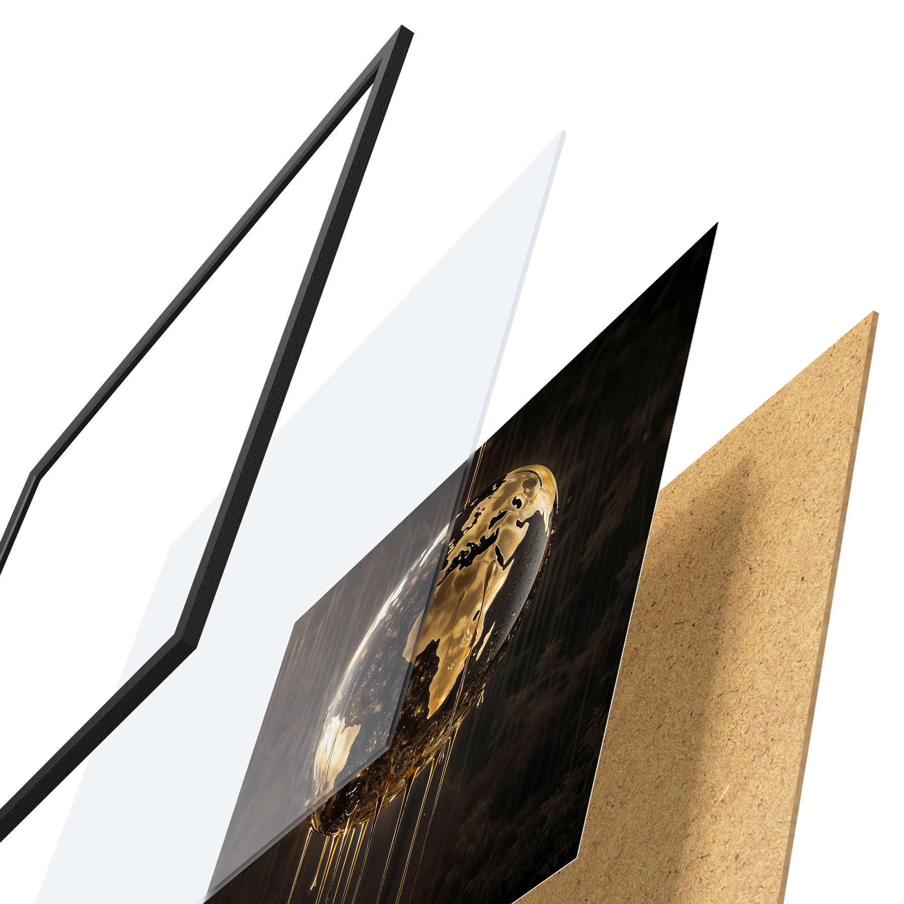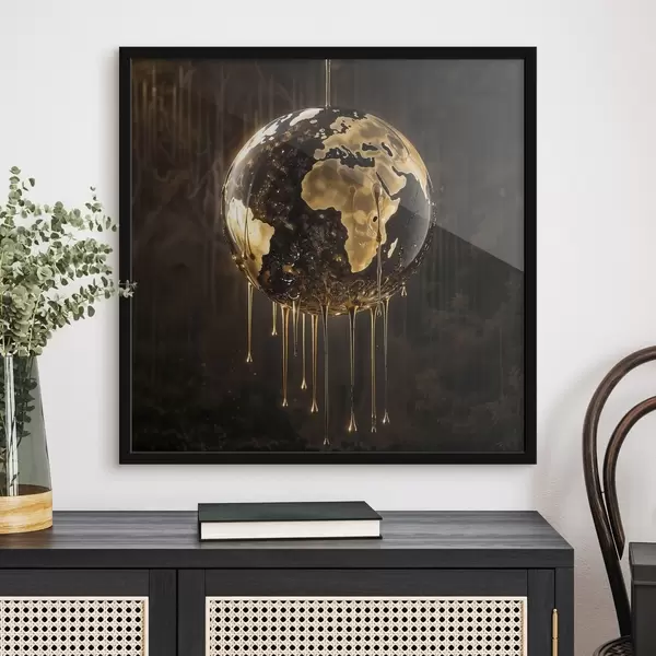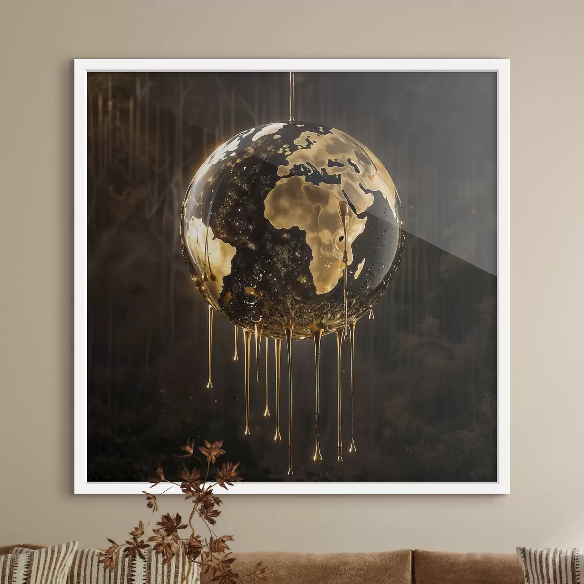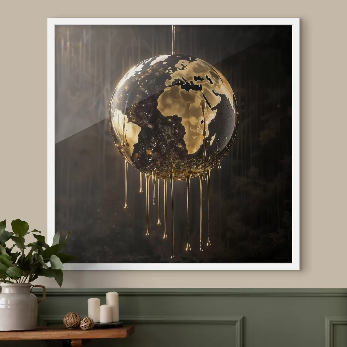 Poster Hõõguv pall, mis kujutab Maad, mida tumedal taustal ümbritsevad tilkuvad vedelikud Nr f38983