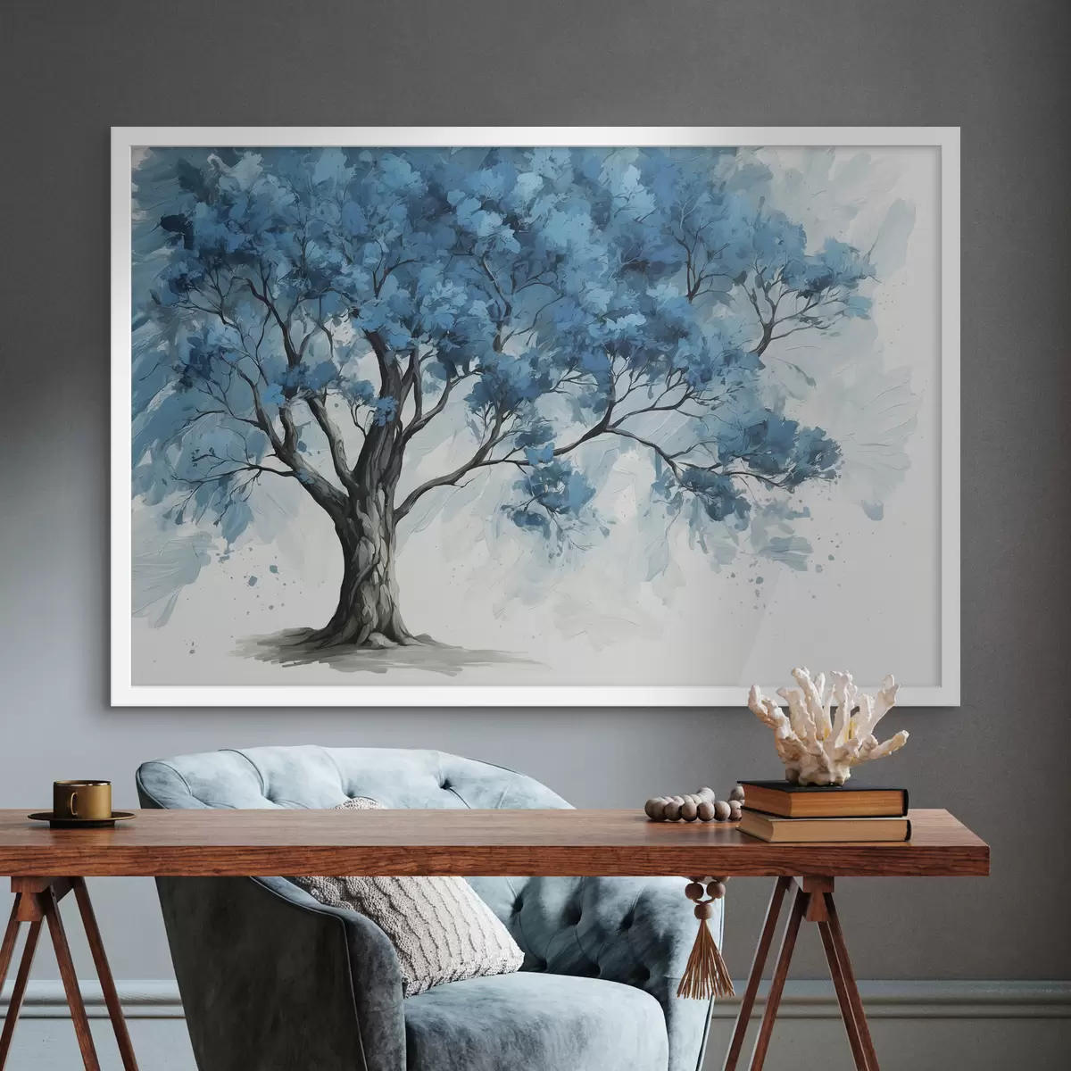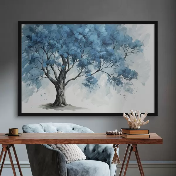 Plakat Siniste lehtedega puu valgel taustal f39153