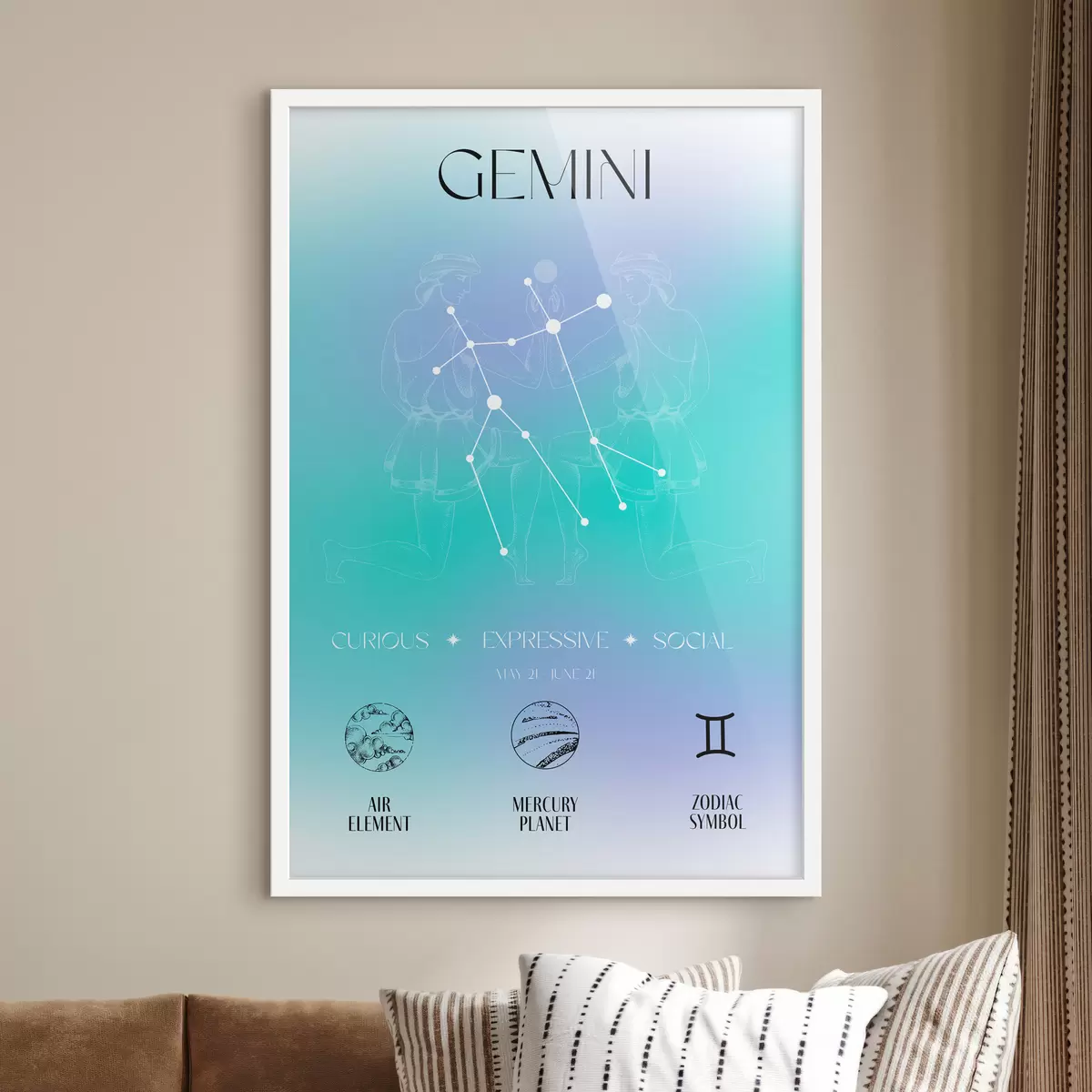 Poster Kaksikute sodiaagimärk, tähtkujud, kosmiline, planeedid, astroloogia, sinised ja lillad värvid Nr f39279