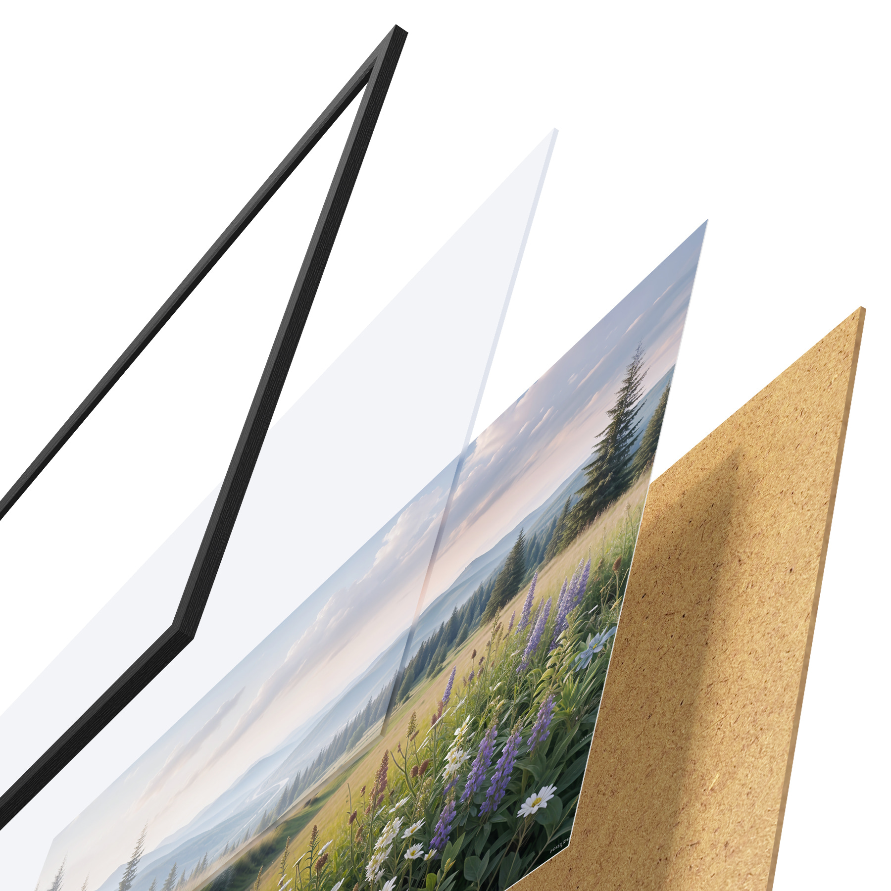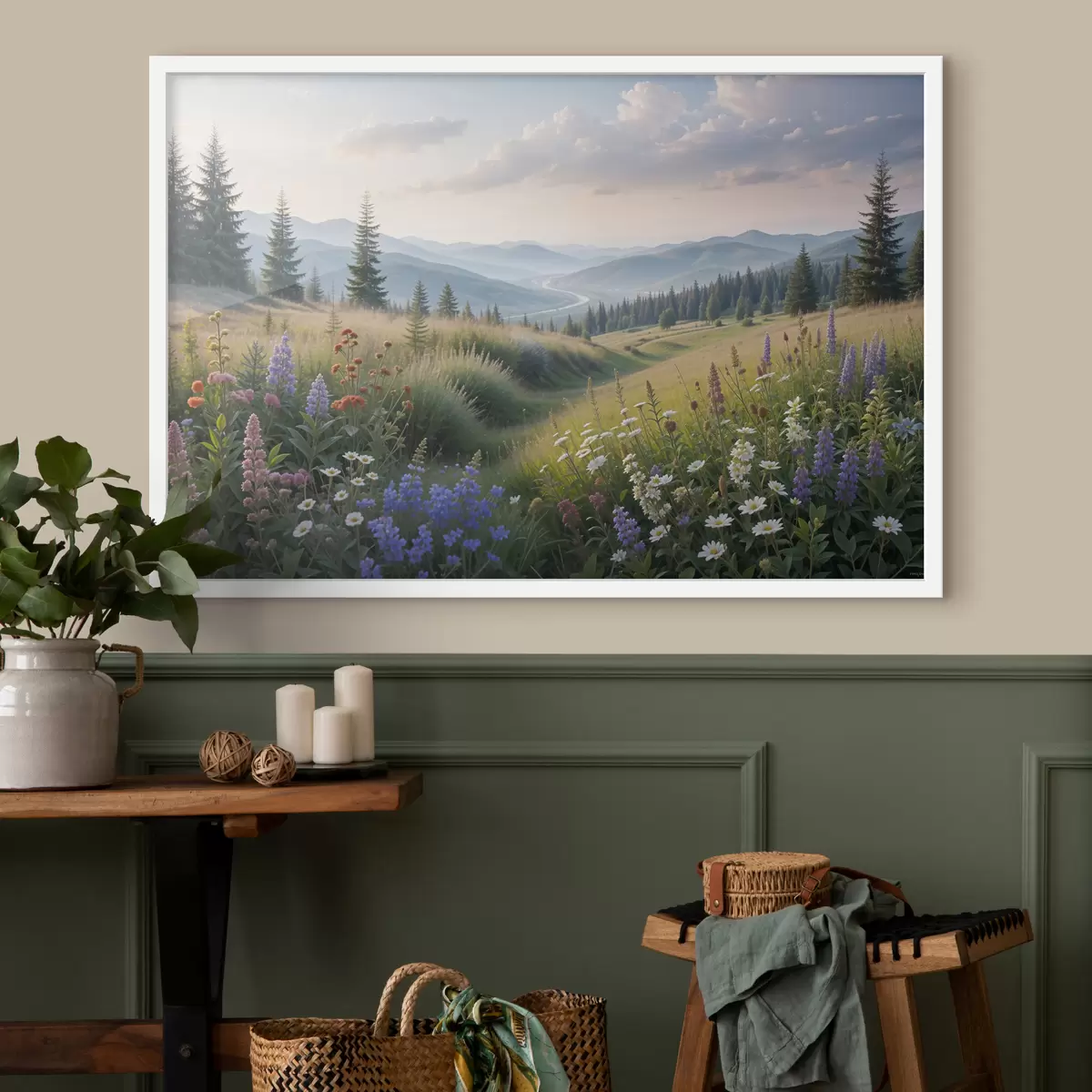 Plakat Mägimaastik, mille esiplaanil on värviliste metsalilledega täidetud heinamaa f39382