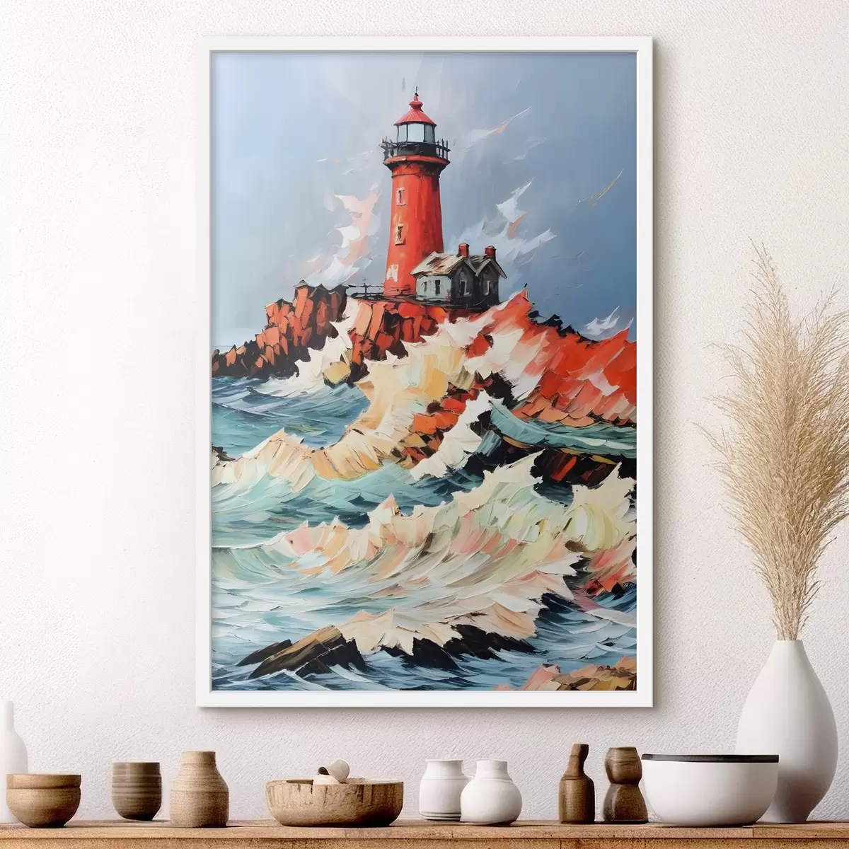 Plakat Maal punasest tuletornist, mis seisab kõrgel kivisel kaljul, ümbritsetud lainete ja tormise taevaga f39392