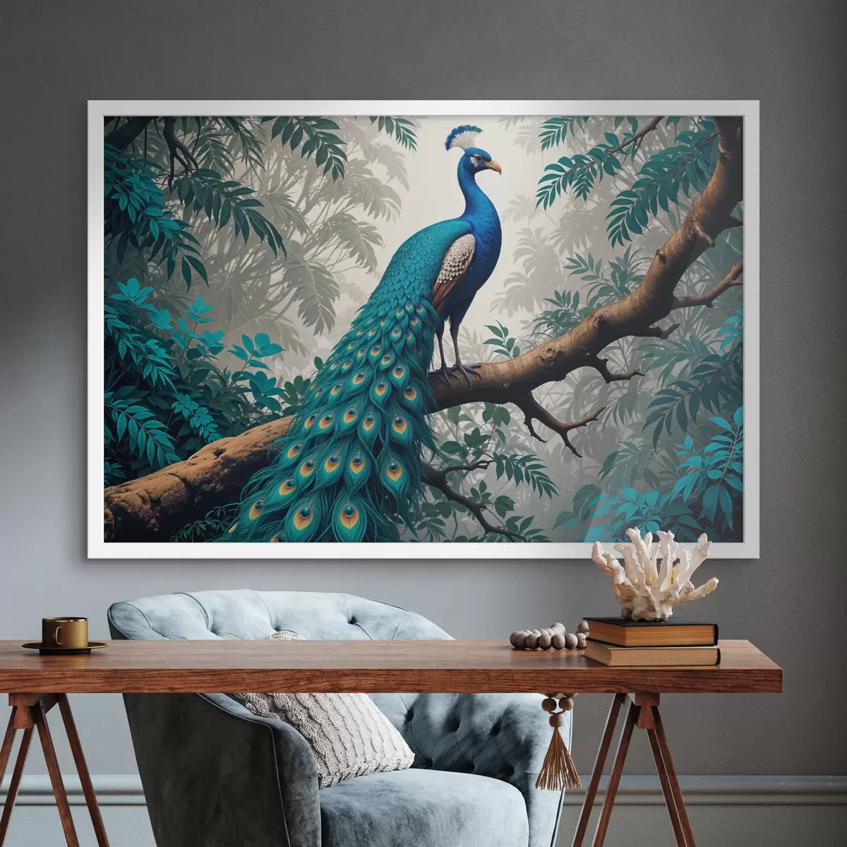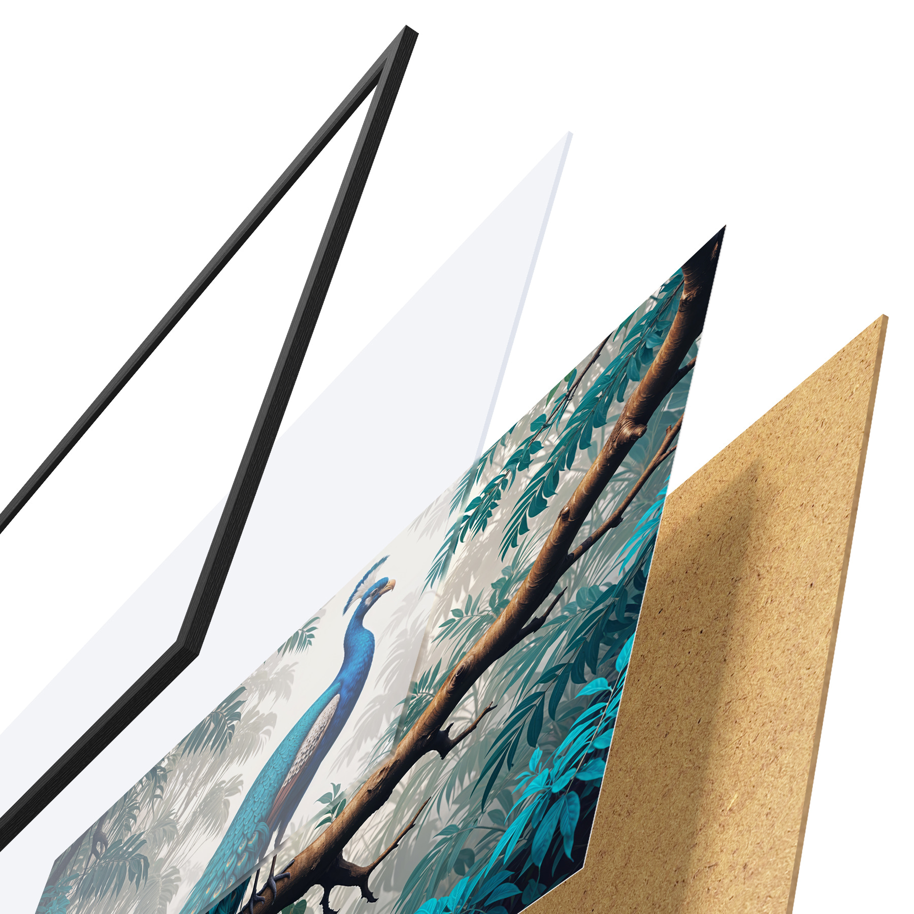 Plakat Särav sinine paabulind istus lopsakas troopilises metsas puuoksal f39401