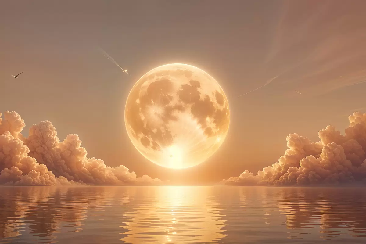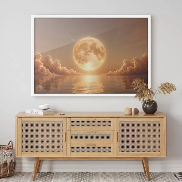 Plakat Suur, särav täiskuu tõuseb päikeseloojangul üle rahuliku, peegeldava ookeani f39403