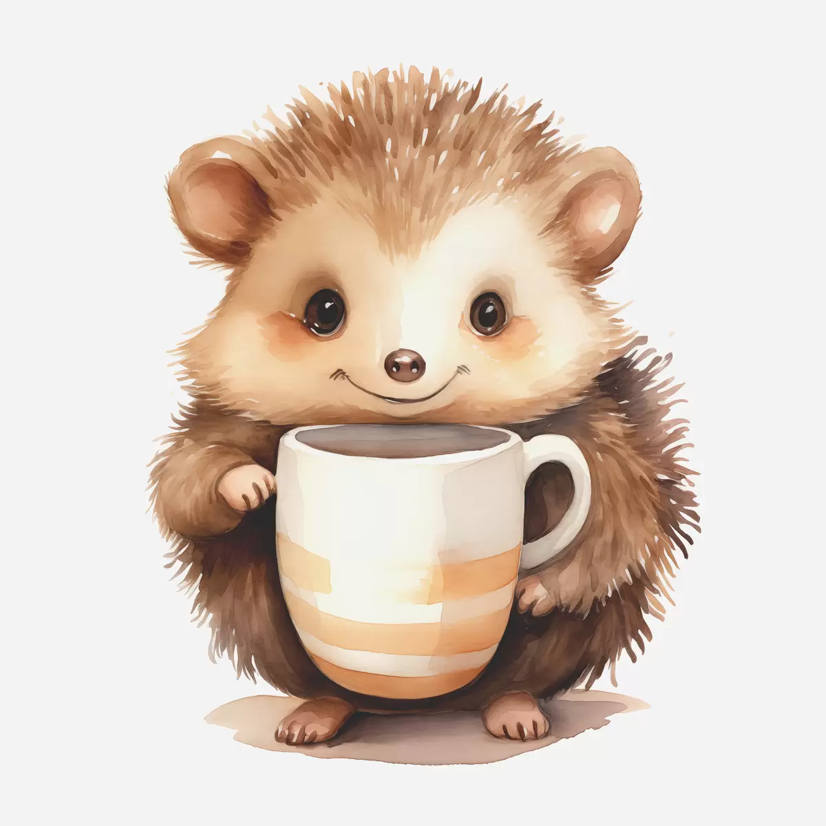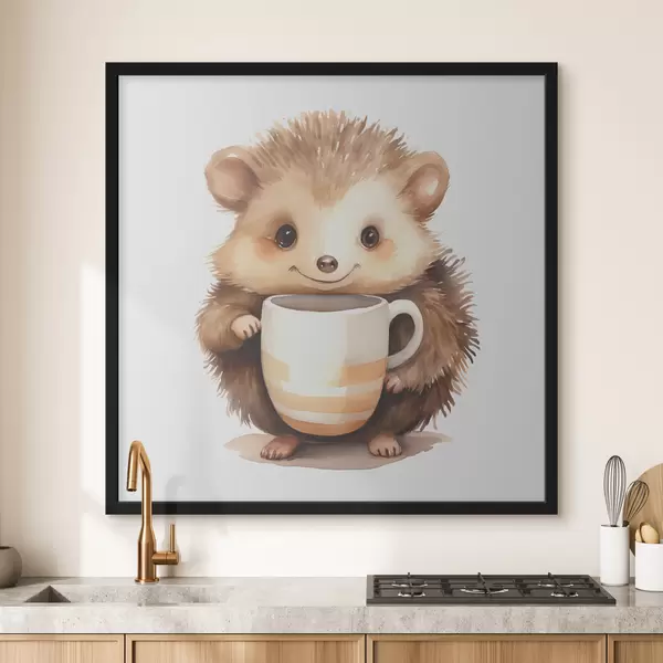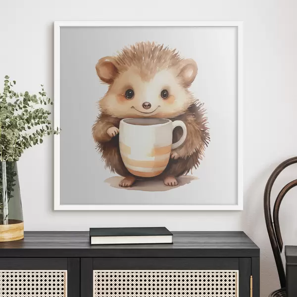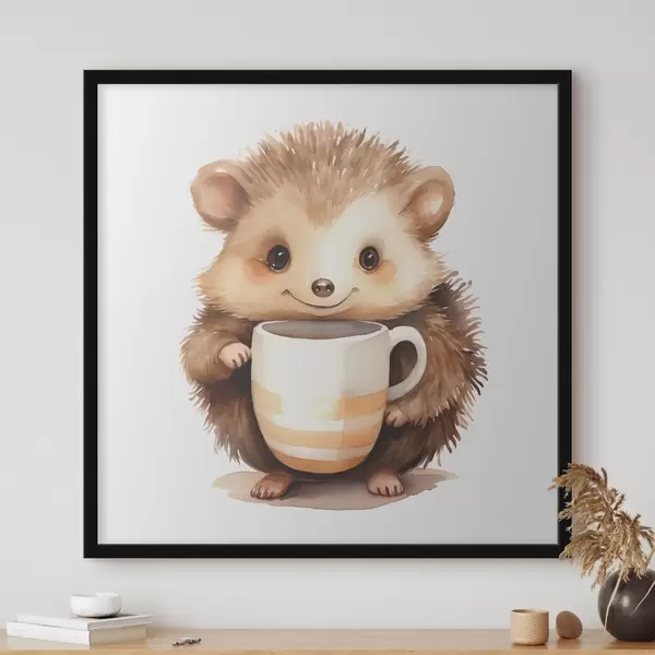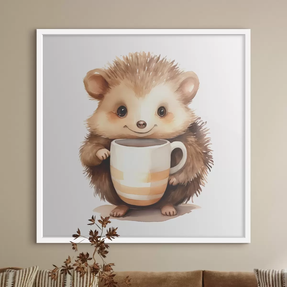 Poster Siil, kes hoiab käpuli valget tassi, akvarellillustratsioon lastele Nr f39440