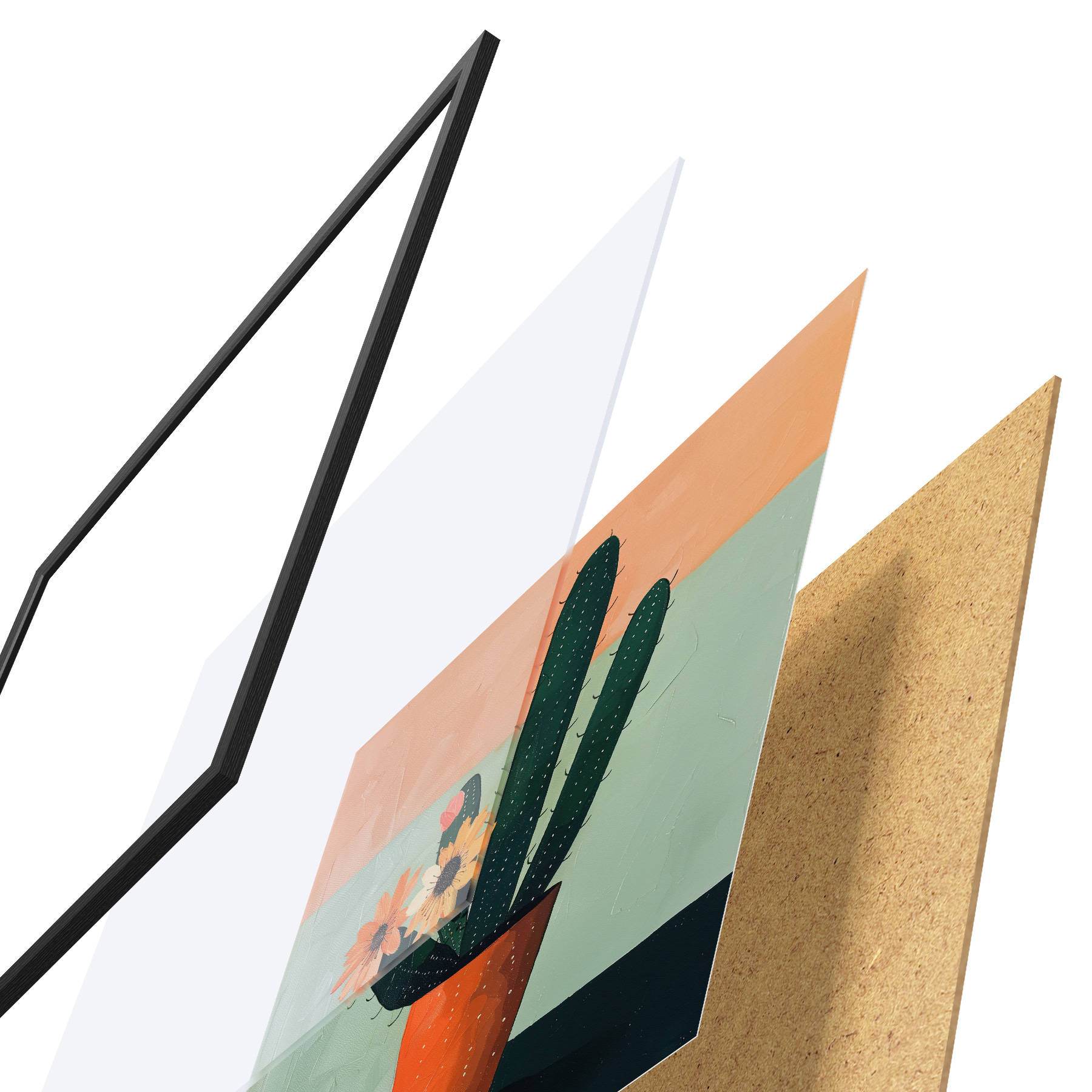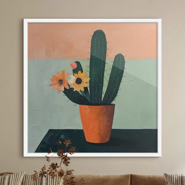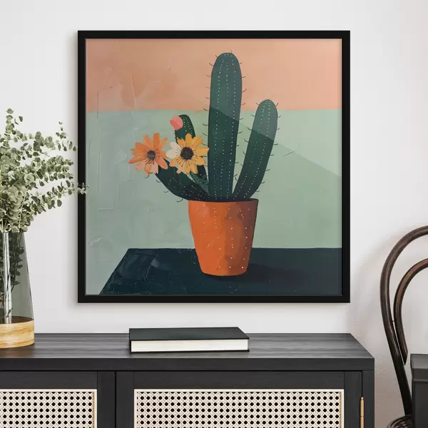 Poster Minimalistlik maal ühest kaktusest julges värvipaletis lilledega. Nr f39452