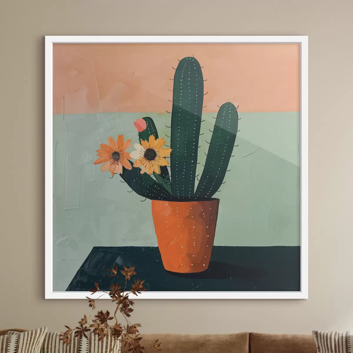 Plakat Minimalistlik maal ühest kaktusest julges värvipaletis lilledega. f39452
