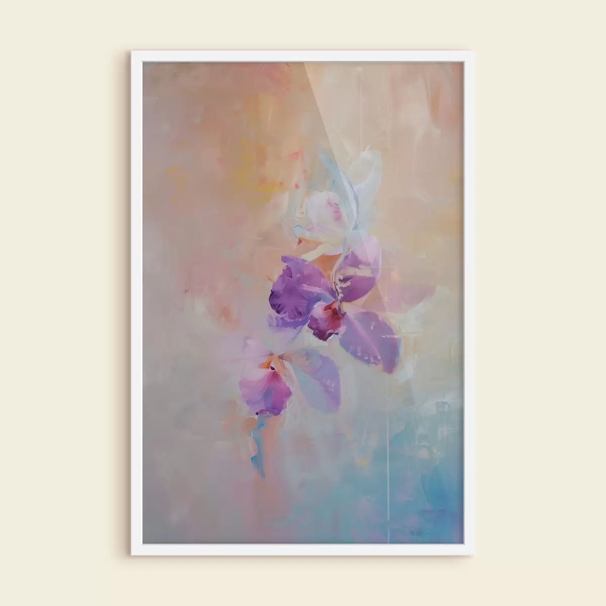 Plakat Impressionistlik orhideemaal, heledad pastellvärvid, poolabstraktne botaaniline trükk, neutraalse taustaga f39463