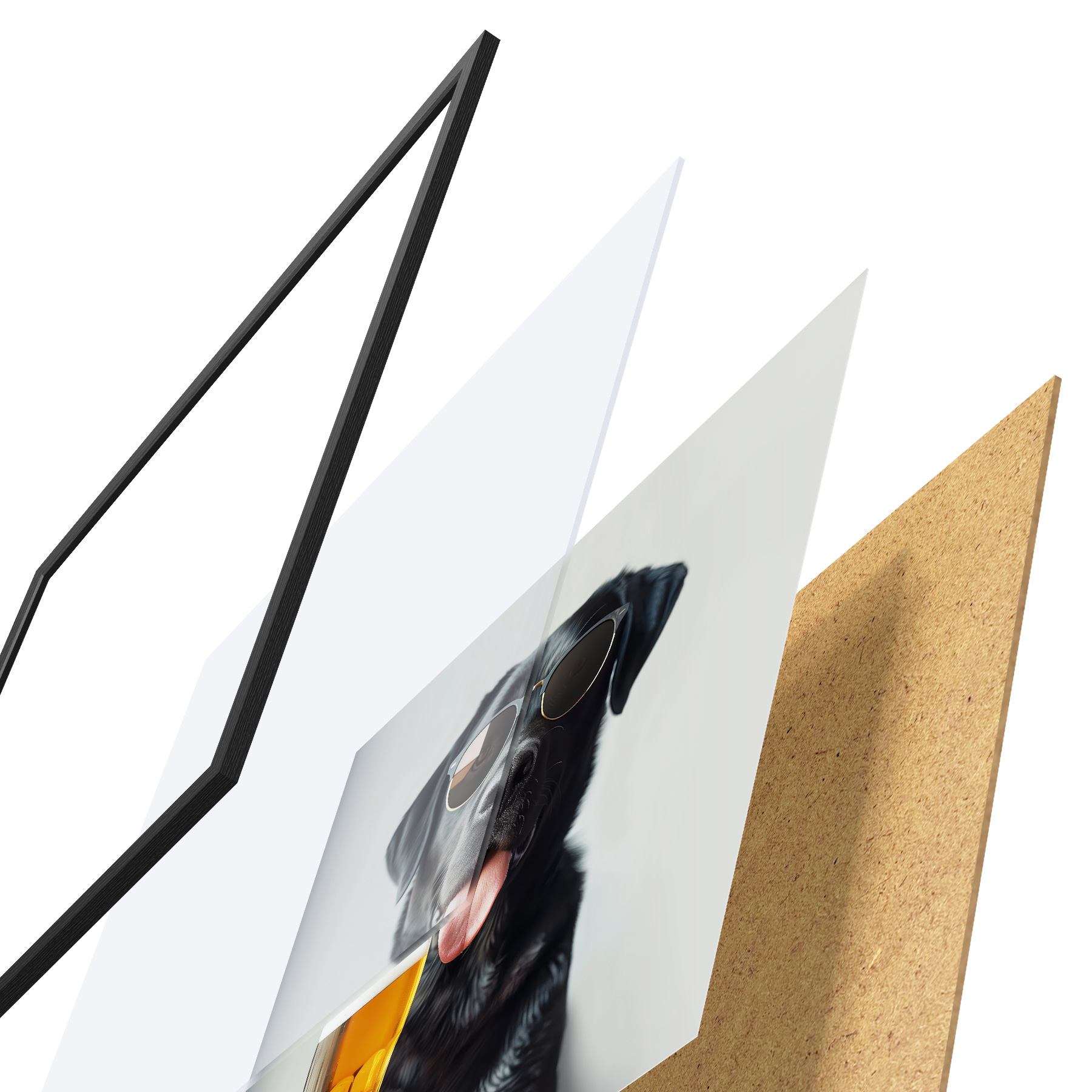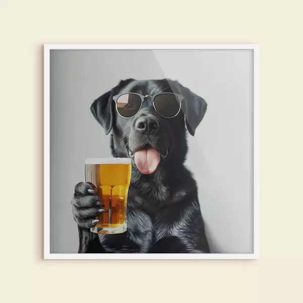 Plakat Portree mustast labradorist, kes kannab päikeseprille ja hoiab käes õllekruusi, vaadates otse kaamerasse f39470