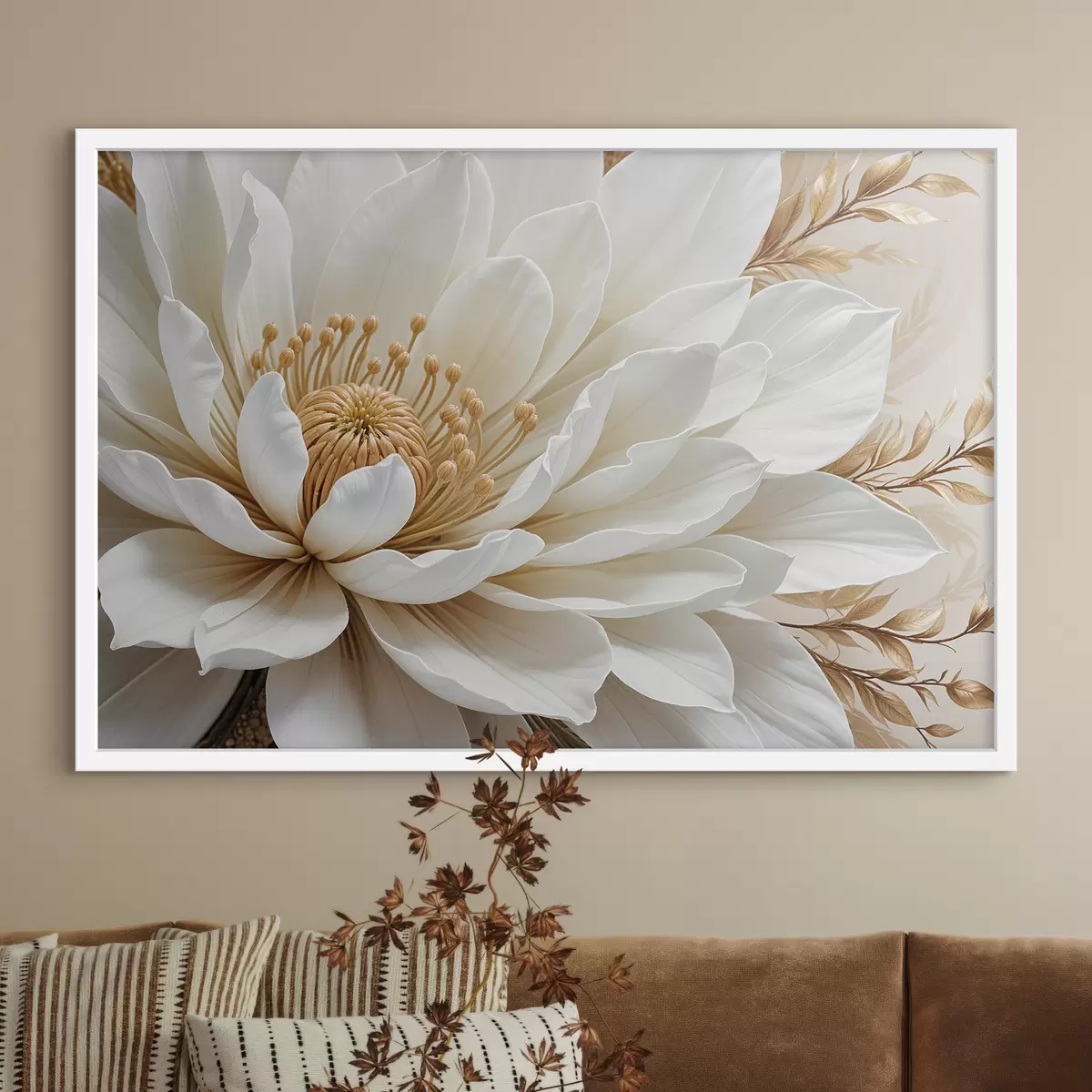 Plakat Lähivõte suurest valgest õrnade kroonlehtede ja elava kollase keskosaga daaliaõiest f39508