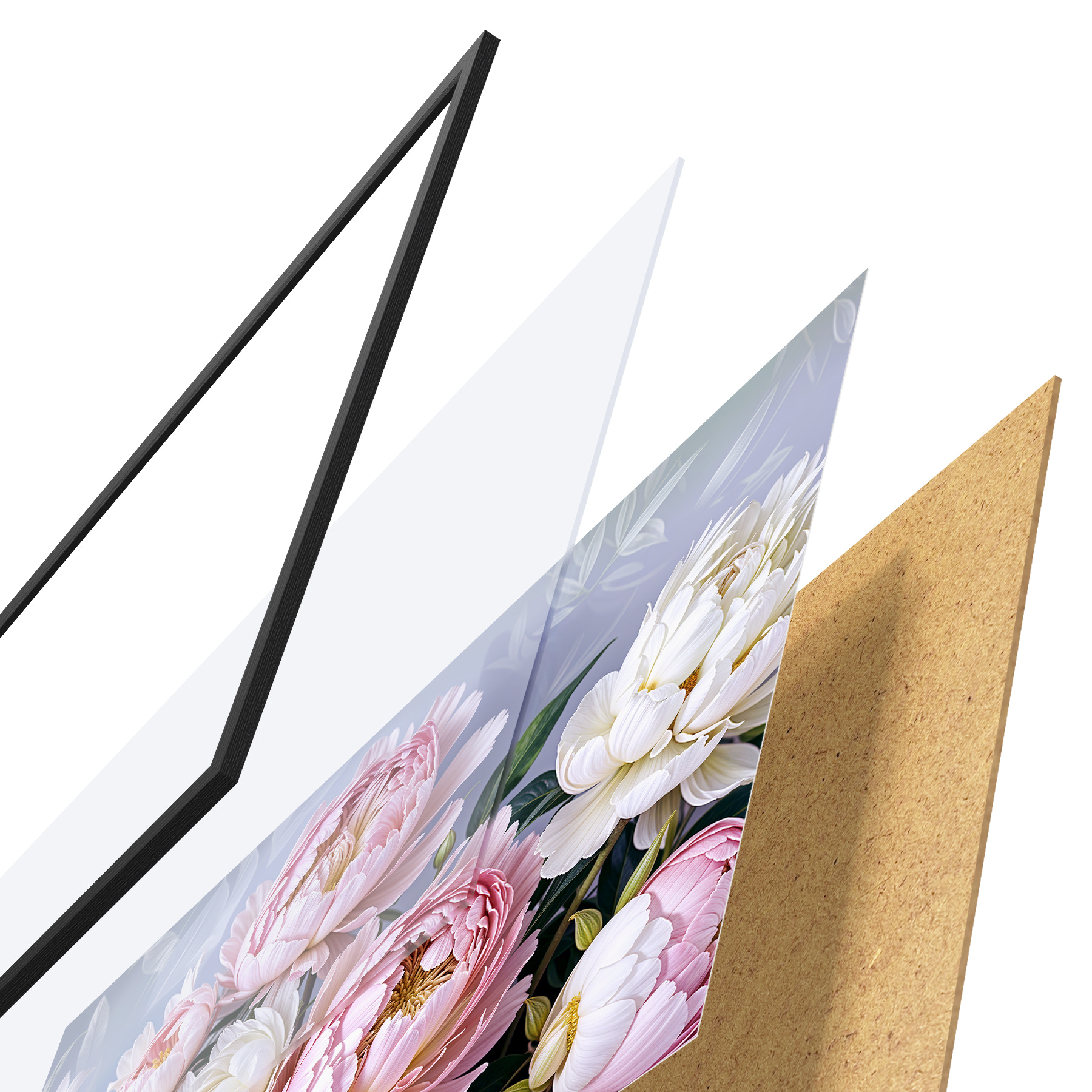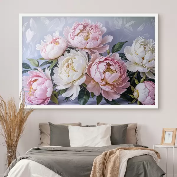 Plakat Suurte, lopsakate roosade ja valgete pojengiõite kimp roheliste lehtedega pehmel udusel taustal f39514