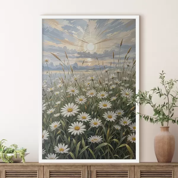 Plakat Esiplaanil valge karikakra lillede väli mägede maastiku ja pilvise taevaga f39528