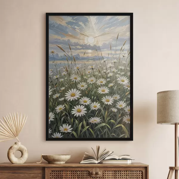 Poster Esiplaanil valge karikakra lillede väli mägede maastiku ja pilvise taevaga Nr f39528