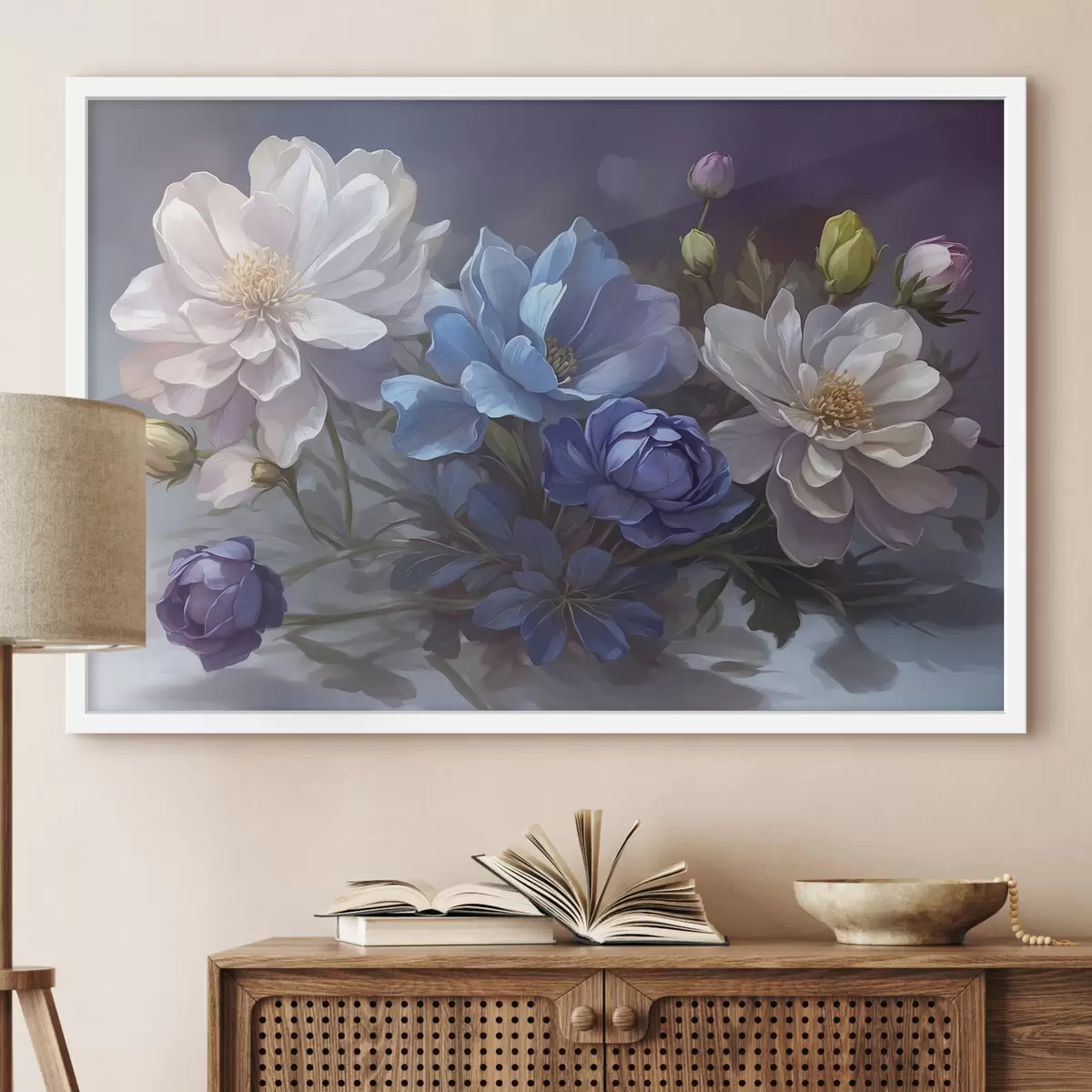 Plakat Valged ja sinised lilled ähmasel taustal f39603