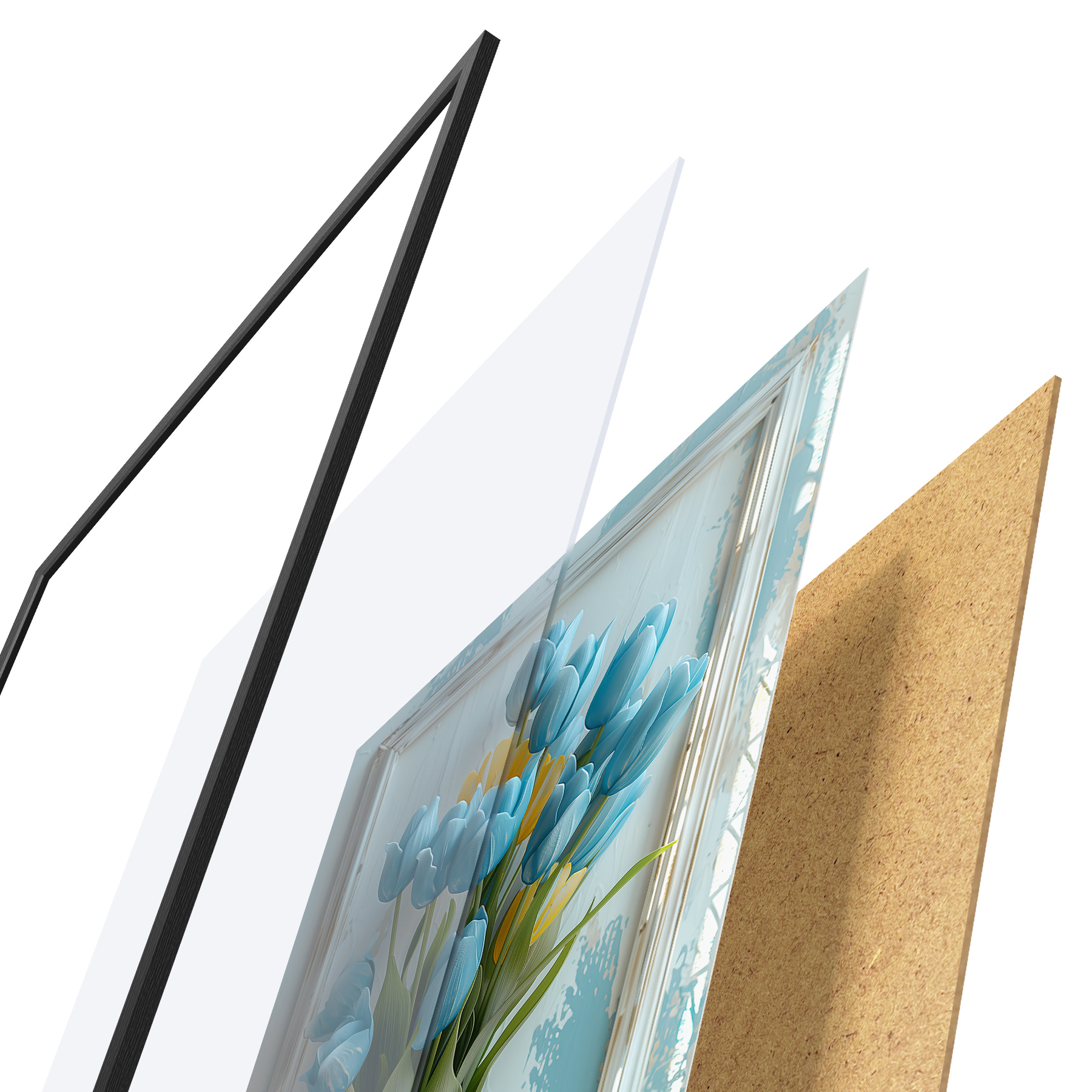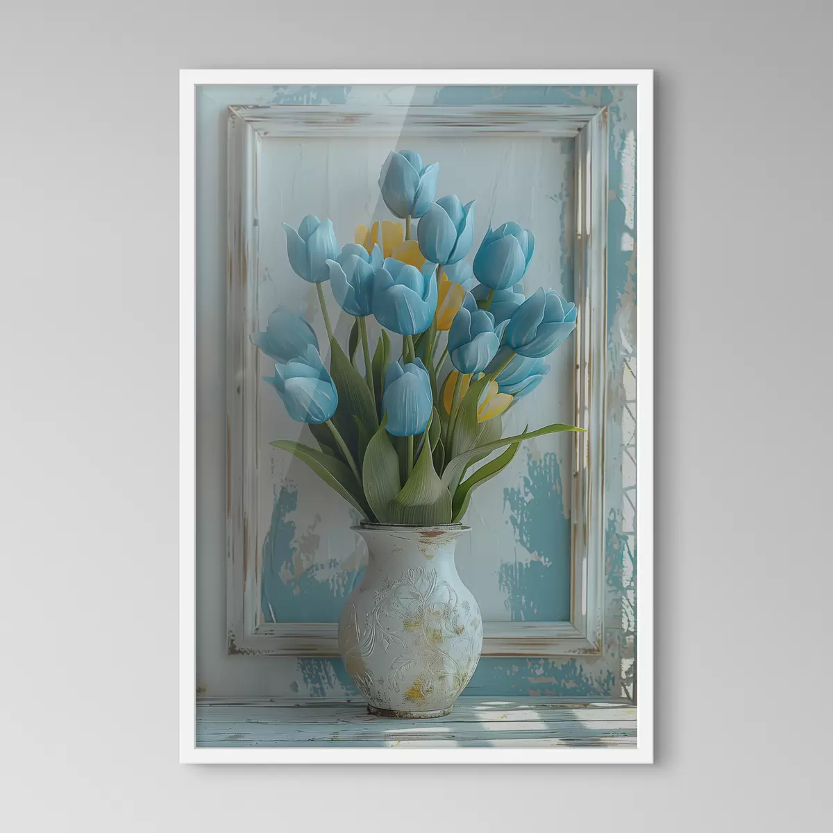 Plakat Sinised ja kollased tulbid 3D-s: elegantne valge raamiga seinapilt, valge ja helesinine taust ning graveeritud vaas f39636
