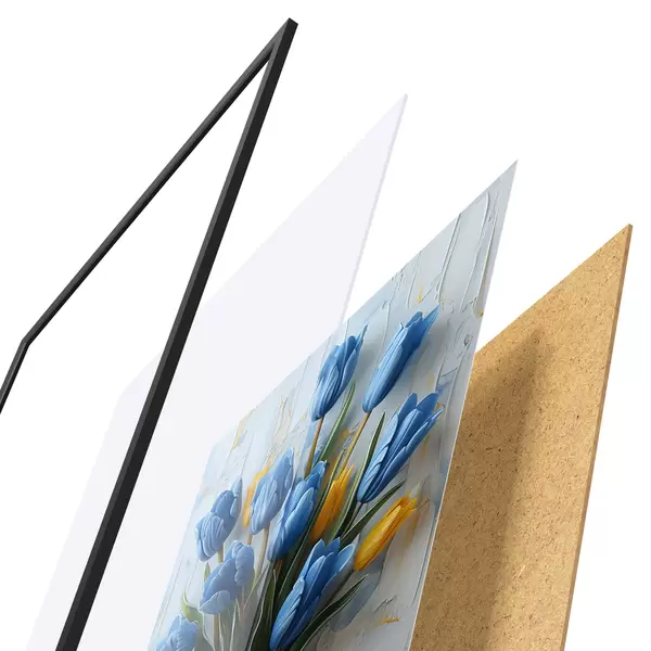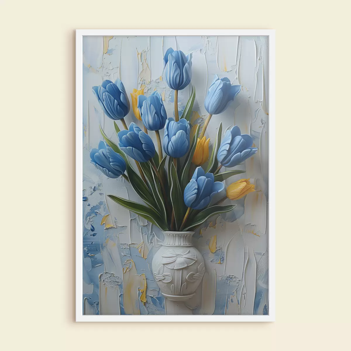 Plakat Sinised ja kollased tulbid 3D-s: elegantne õlivärviga seinapilt valge ja helesinise taustaga ning graveeritud vaas f39637