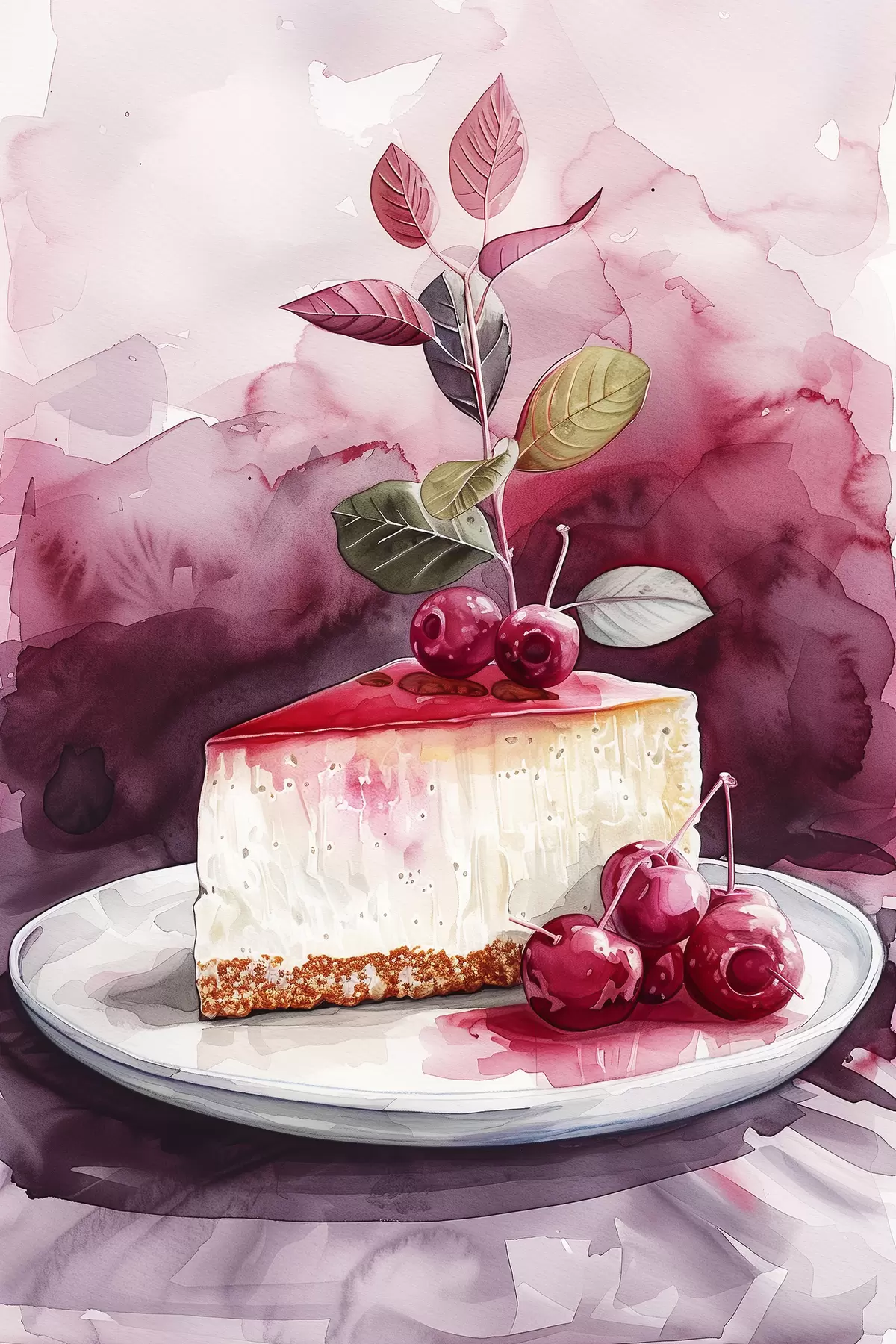 Plakat Akvarell-juustukook kirssidega, elegantne toidukunst, punased ja lillad värvid f39700